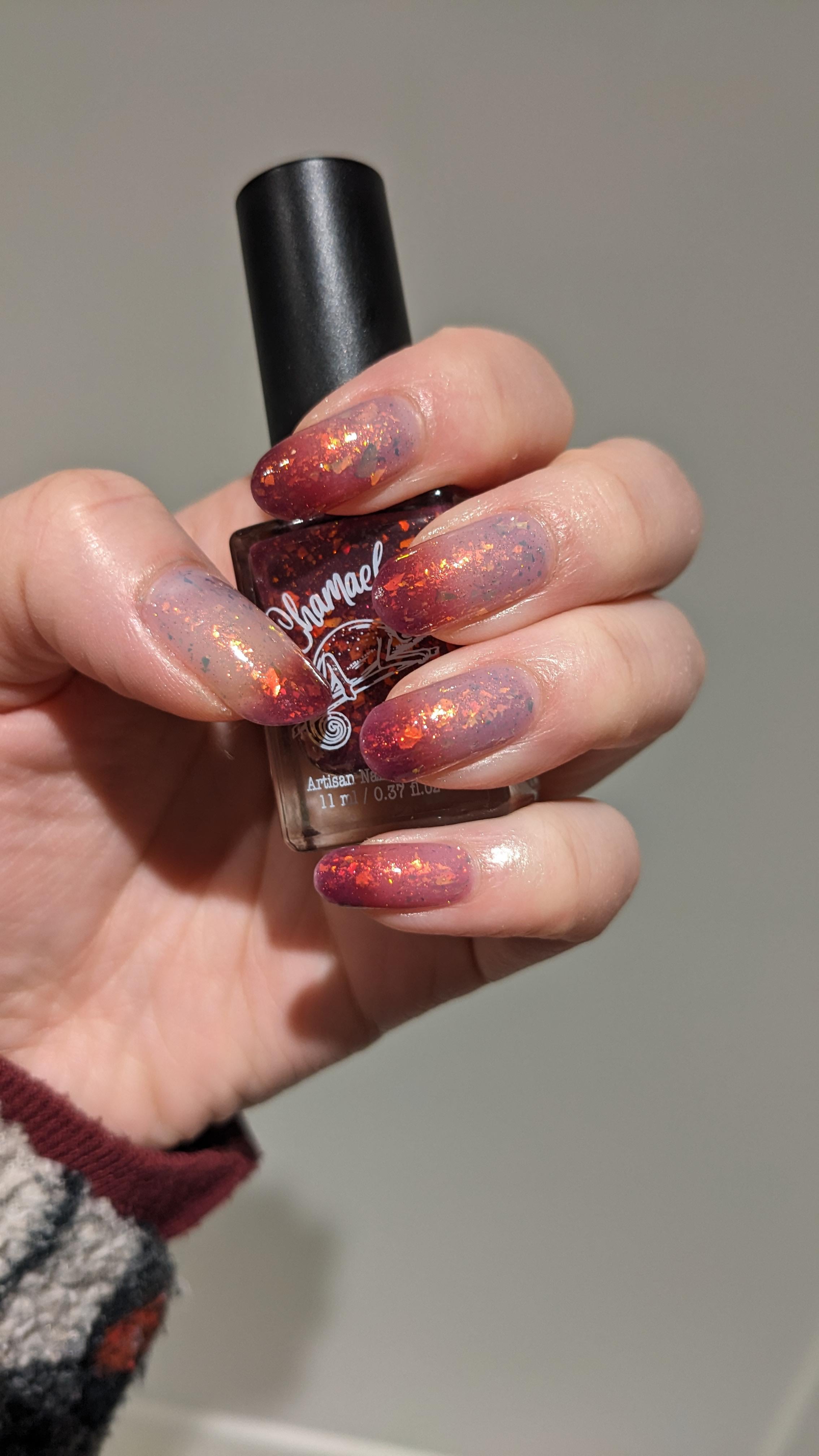 This is also my first thermal (from an indie brand) and I'm obsessed with watching the colour shifts!! 1x Sally Hansen Strengthening Base Coat, 3x Chameleon Nails Newborn Flame (PPU Feb 26), 1x Holo Taco Glossy Taco by tigers-in-tophats