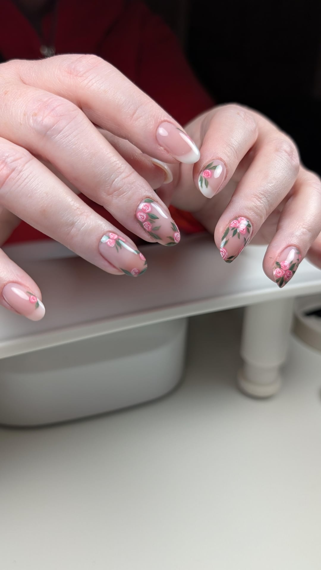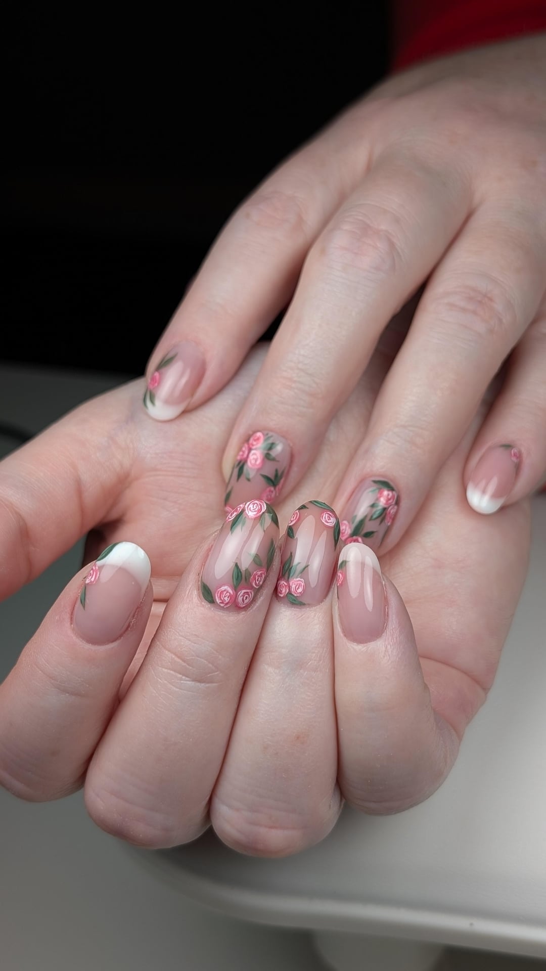 The French is hard gel white + with sheer pink hard gel, slightly overlapping. Everything hand painted 🌹 by TheNailYeti