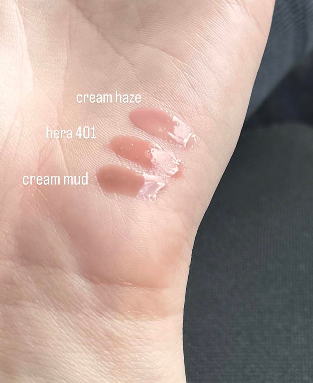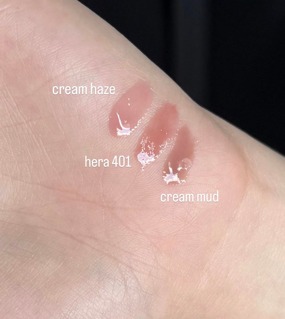 just a few swatches of the new romand glosses(shades cream mud and cream haze alongside Hera's gloss in 401)!! i have a lot of lip products so if anyone would like to see a specific shade comparison lmk and ill see if i have it!! i also swatched them in a video with other shades of the gloss which i'll put a link for:
