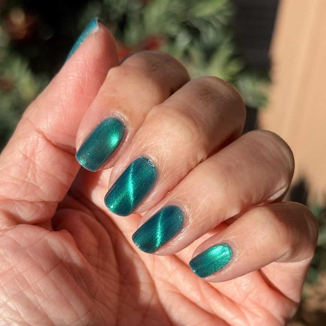 I’ve heard NyQuil nails thrown around a few times in this sub and if you’re looking for that NyQuil softgel look, look no further. I added MC River Styx as an opacity base because ANLAC’s formula is so sheer it would have taken me about 4 coats to get the same look. I magnetized the 2nd coat of Le Prieur and the Magic Effect layer for about 45 seconds each. I used the 5D spinner for thumb, pinky, and index and a neodymium bar magnet to stripe my middle and ring.