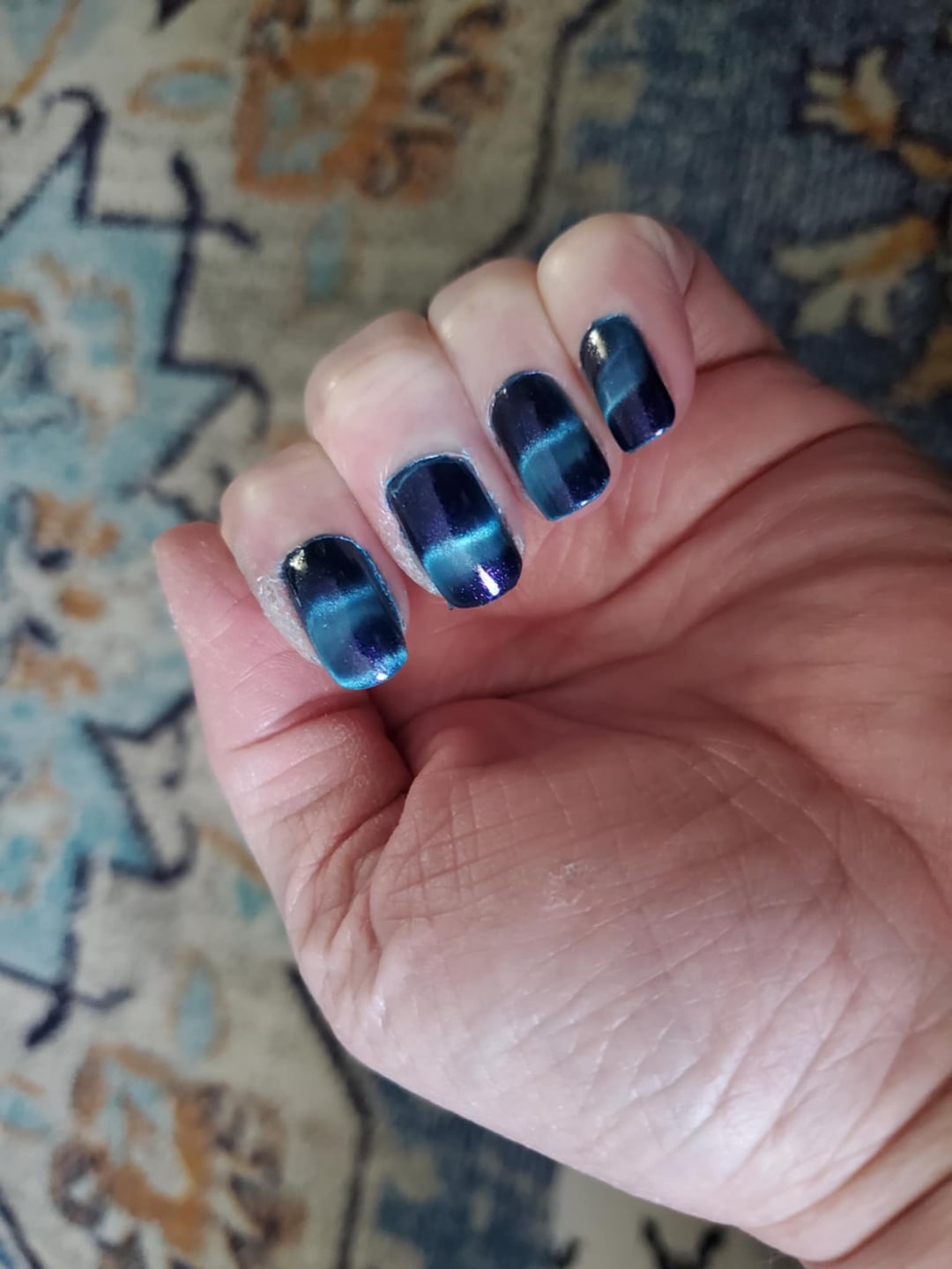 Not a new technique, but this was done with a horseshoe magnet, with a magnet on the top and the end. I have added a photo to show, since I know I didn't explain it well. It gives an aurora type effect on the nail.