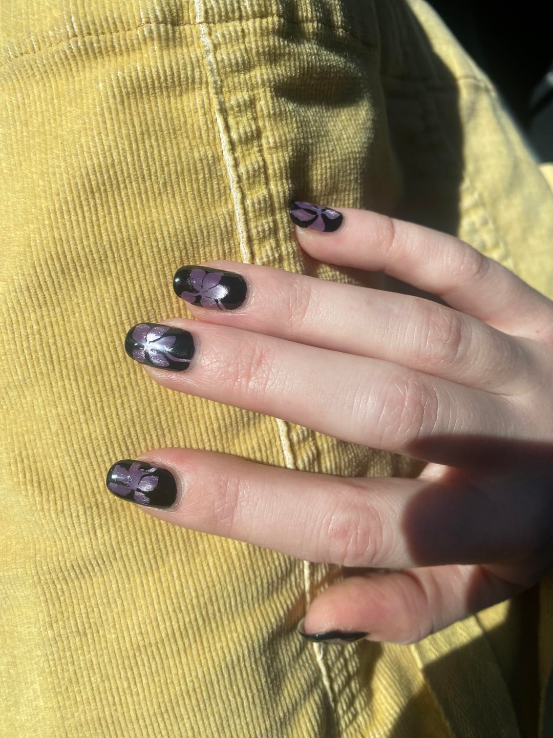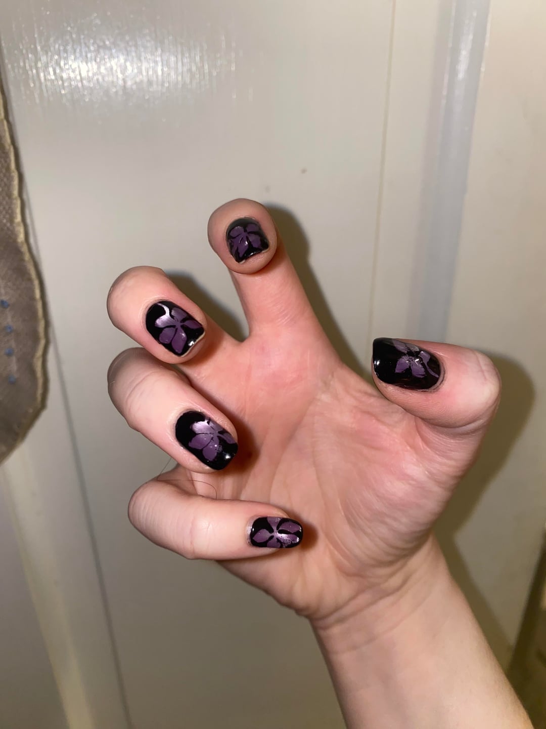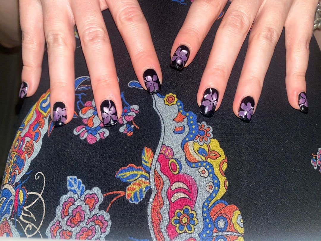 • 1x essie smooth-e base • 1x Glitch “Liberation” (magnetized w magnetic stirrer)• Twinkled T nail vinyls •1x Haunted “Goth” • 2-3x essie gel couture tc/Cracked qdtc (this step got a little out of control)