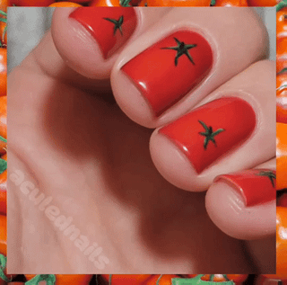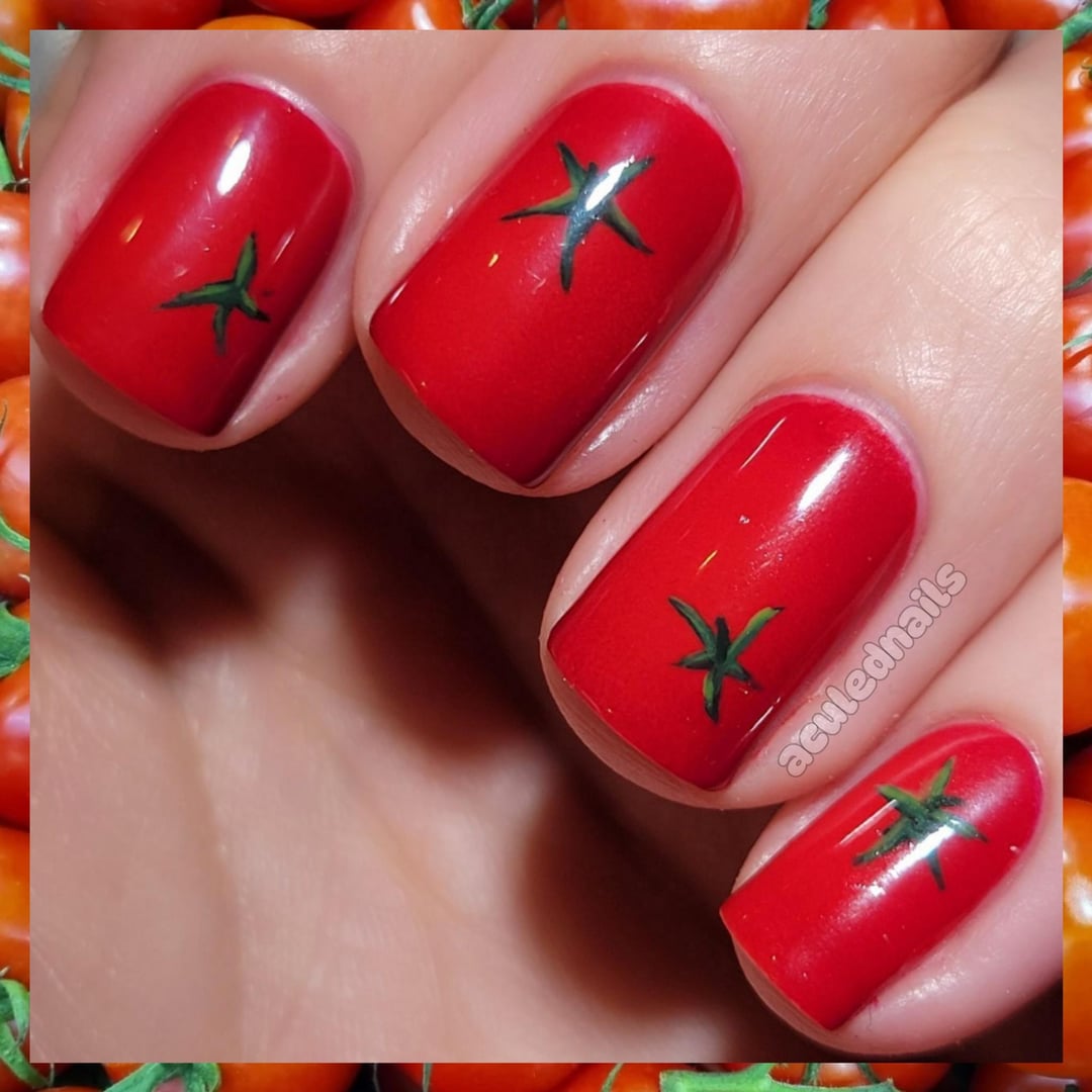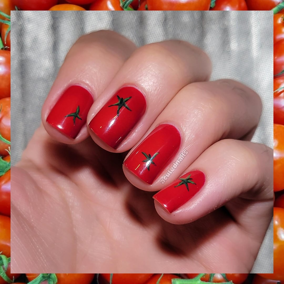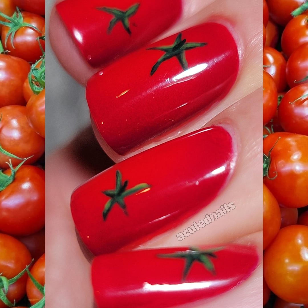 I fricken LOVE weird real world inspo for nails, and I had in my inspo folder a random tomato nail art I saw on pi trest a few years ago and it's always sat there waiting to be done. Today is that day. Celebrate our favorite savory berry! 🍅👏🙌 I did a gentle aura gradient for a touch of dimension, as well as to stain my skin and cuticles, cuz who doesnt love that?! Then it was time.for little green parts, and BOOM. Tomato nails. Fuck yeah.