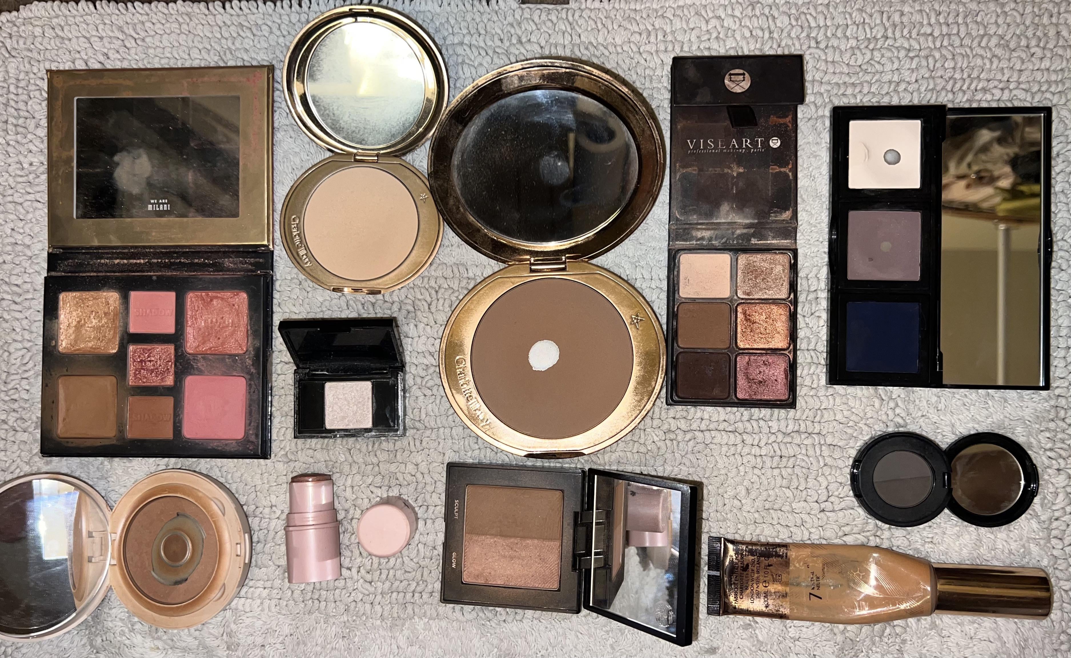 Milani All Inclusive Face Palette, Laura Mercier Translucent Medium Deep, Mineral Fusion 3-in-1 Magnetic, Trish McEvoy white shadow, Laura Mercier 20 Marseille, Charlotte Tilbury Foundation #7, Anastasia Brow Ash brown, Bobby Brown in Rich Navy Heather and Ivory, Viseart Theory Palette in Minx, Charlotte Tilbury Brush Bronzer in Medium 2, and Charlotte Tilbury Airbrush Flawless Finish in 2 Medium