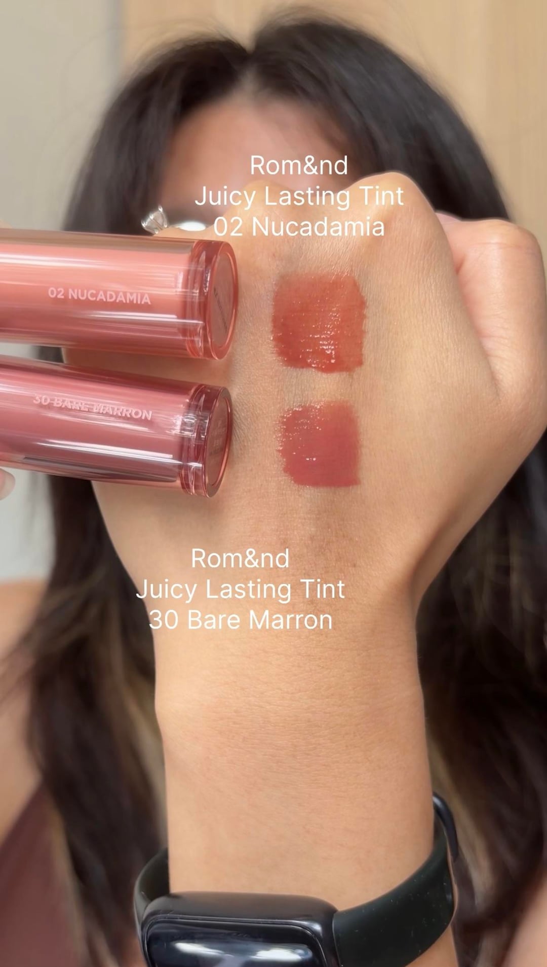 Hey y’all, today I compared Rom&nd Juicy Lasting Tints 02 Nucadamia and 30 Bare Marron on my light medium warm skin tone.