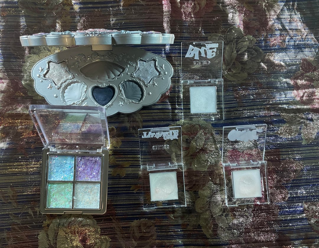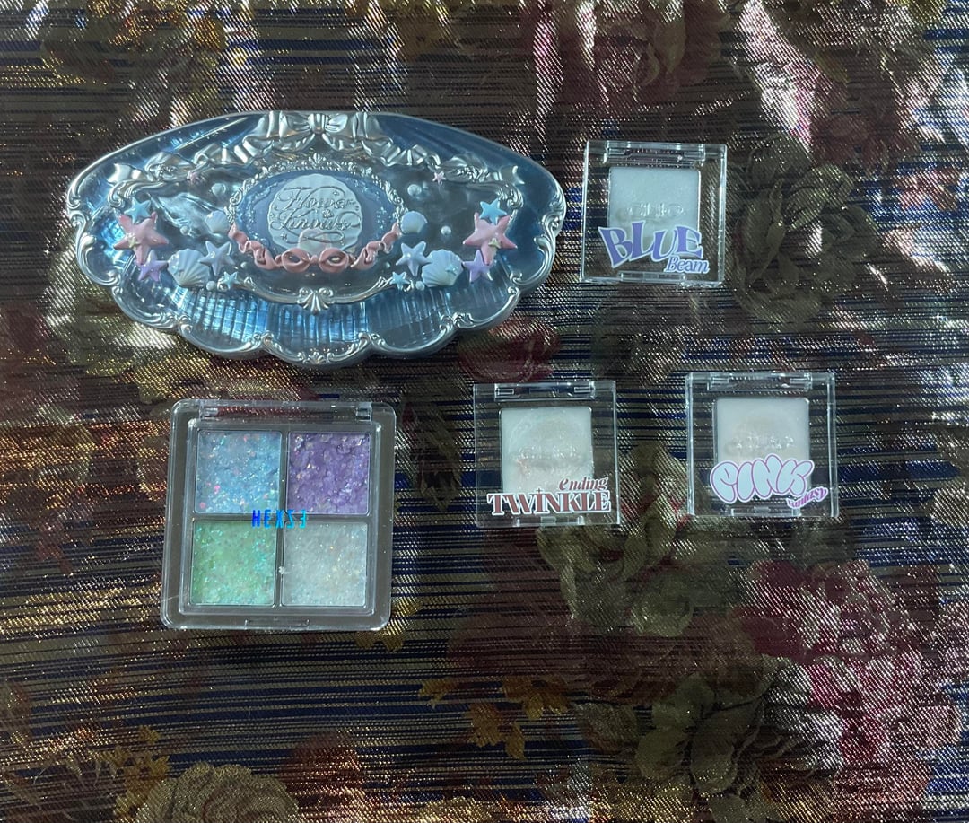 -Slide 16-17: CLIO Mud Glitter in 01 Blue Beam, 03 Twinkle Ending, and 02 Pink Fantasy ; Hexze Sea Island Explore Four Color Eyeshadow Glitters