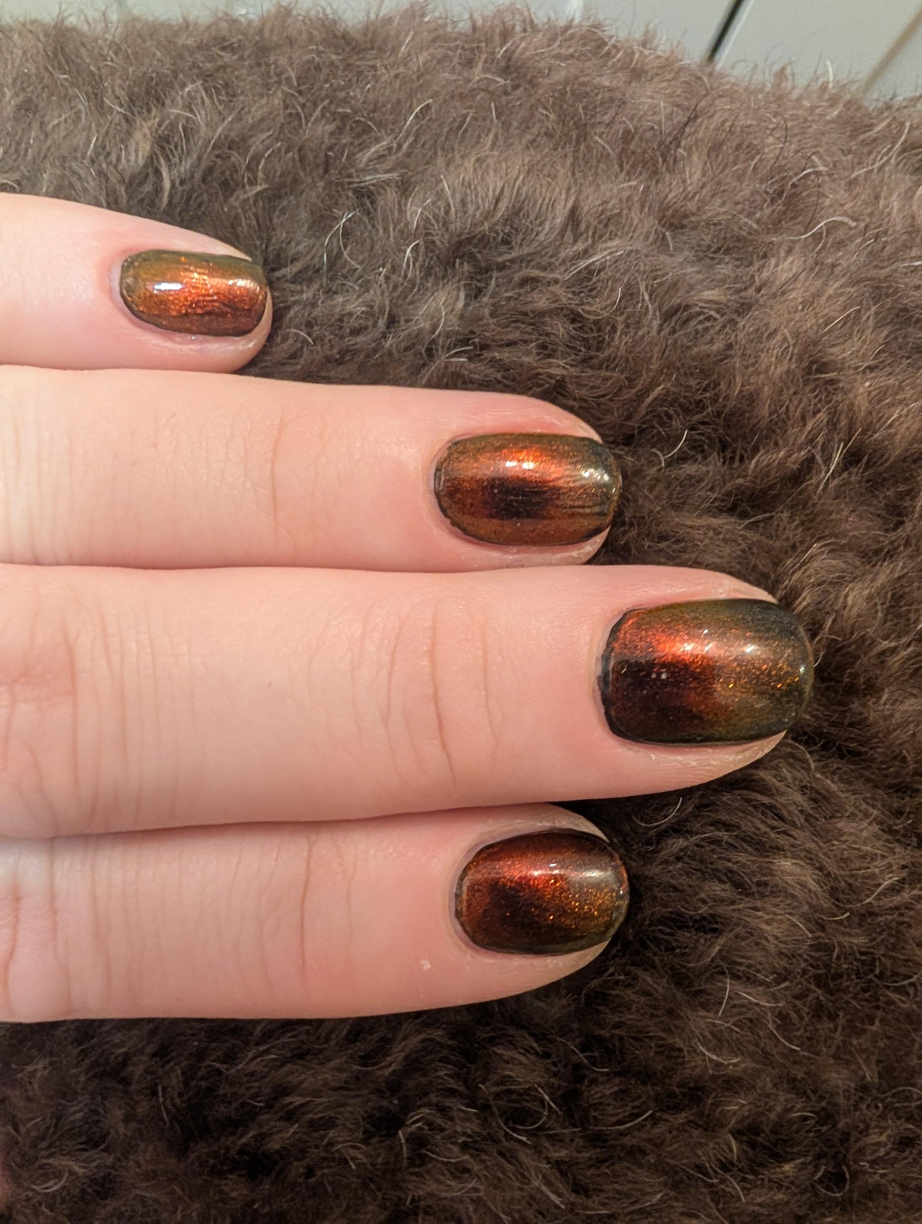 Interesting magnetic affect…. I tried for a glass bead using the fish magnetic lab stirrer. The polish looks like "coffee meets oil spill" to me. Very brown/yellow effect over the black. Looks nice with my brown poodle!
