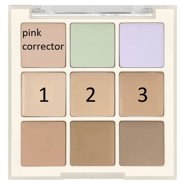 First cheeck is the three concealer shades of the palette. On the second cheeck, swatch closer to the ear is shade 1 and 2 mixed together. Swatch closer to nose is shade 2 mixed with the pink corrector in the top left corner.