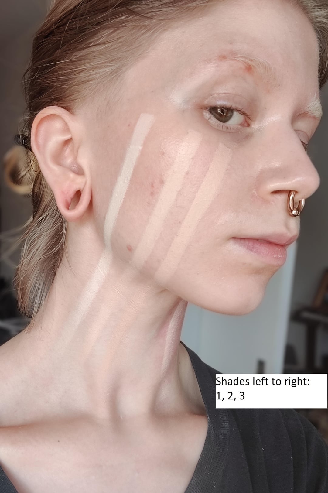The shade 2 is too orange and a bit too dark on it's own. Mix of shade 2 and pink corrector looks good on camera, but in real life it is too pink. Mix of shade 1 and 2 is very close, but a tad too orange, but in real life it's the best and closest match.
