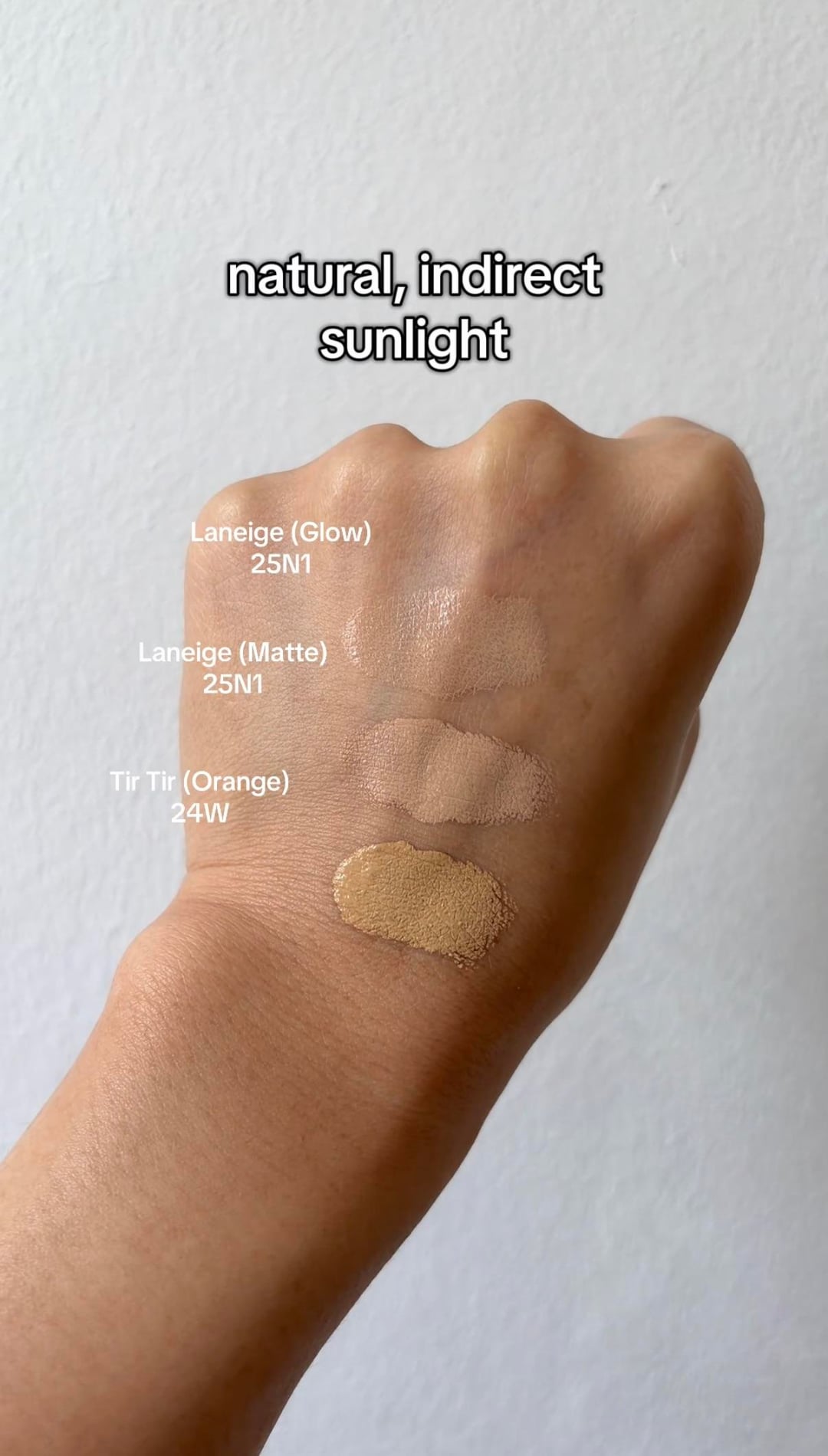Tir Tir Orange Cushion in shade 24W Soft Beige swatches against Laneige Neo Cushions in Glow and Matte versions in 25N1 on my light medium skin tone.
