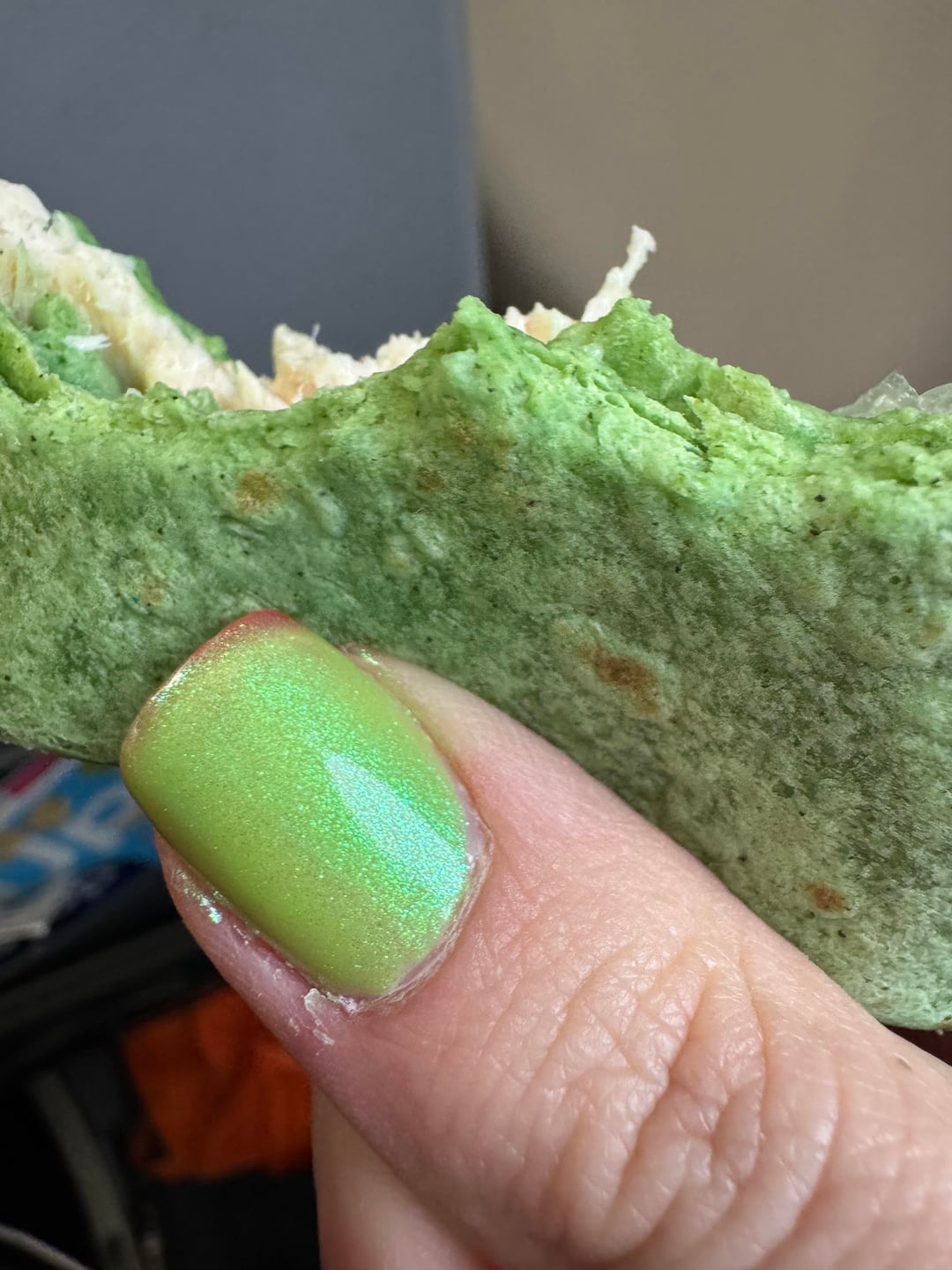 I was enjoying the airport chicken caesar wrap that my husband paid highway robbery prices for and on my last couple of bites, just happened to notice some matchy matching, and figured y’all would understand.