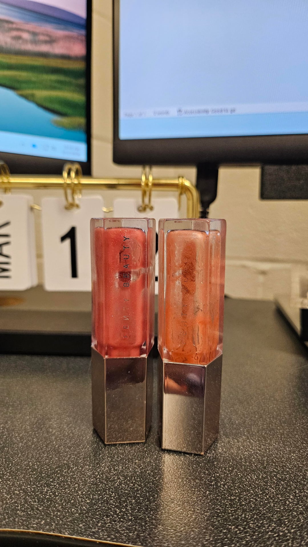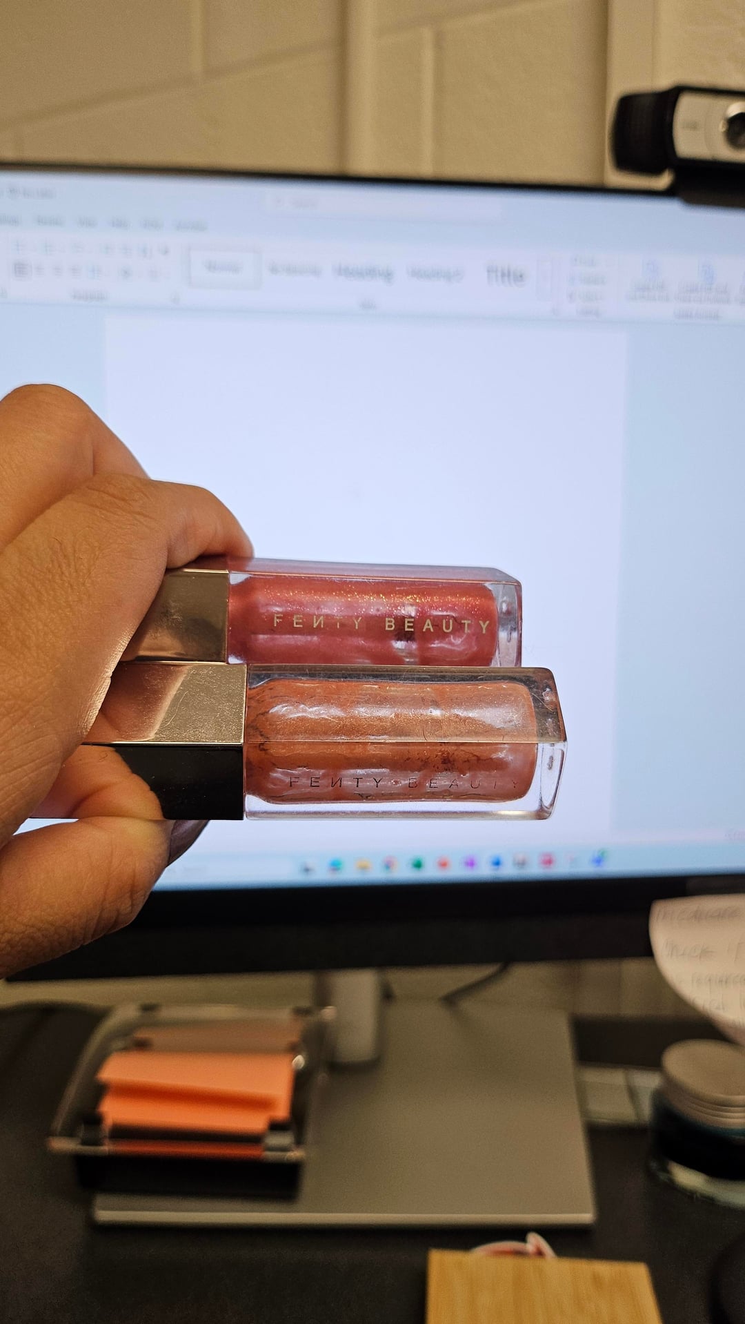 My favorite lip glosses,Fenty Beauty Fenty Riri (right) and Fenty Glow (left). Riri is a bit thicker, it's been upside down everyday and it's all gone for the most part.