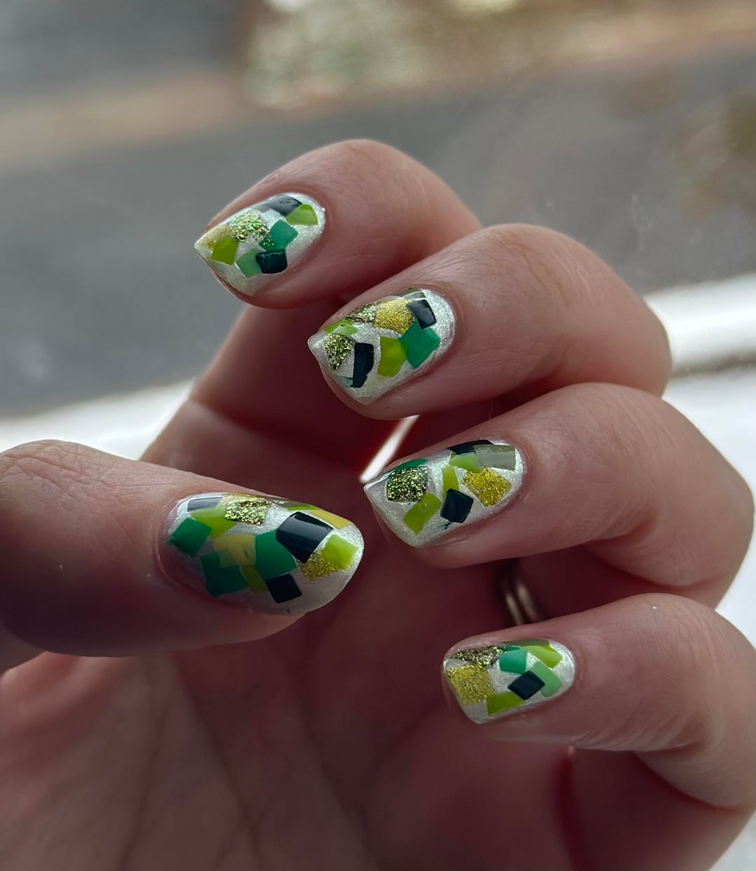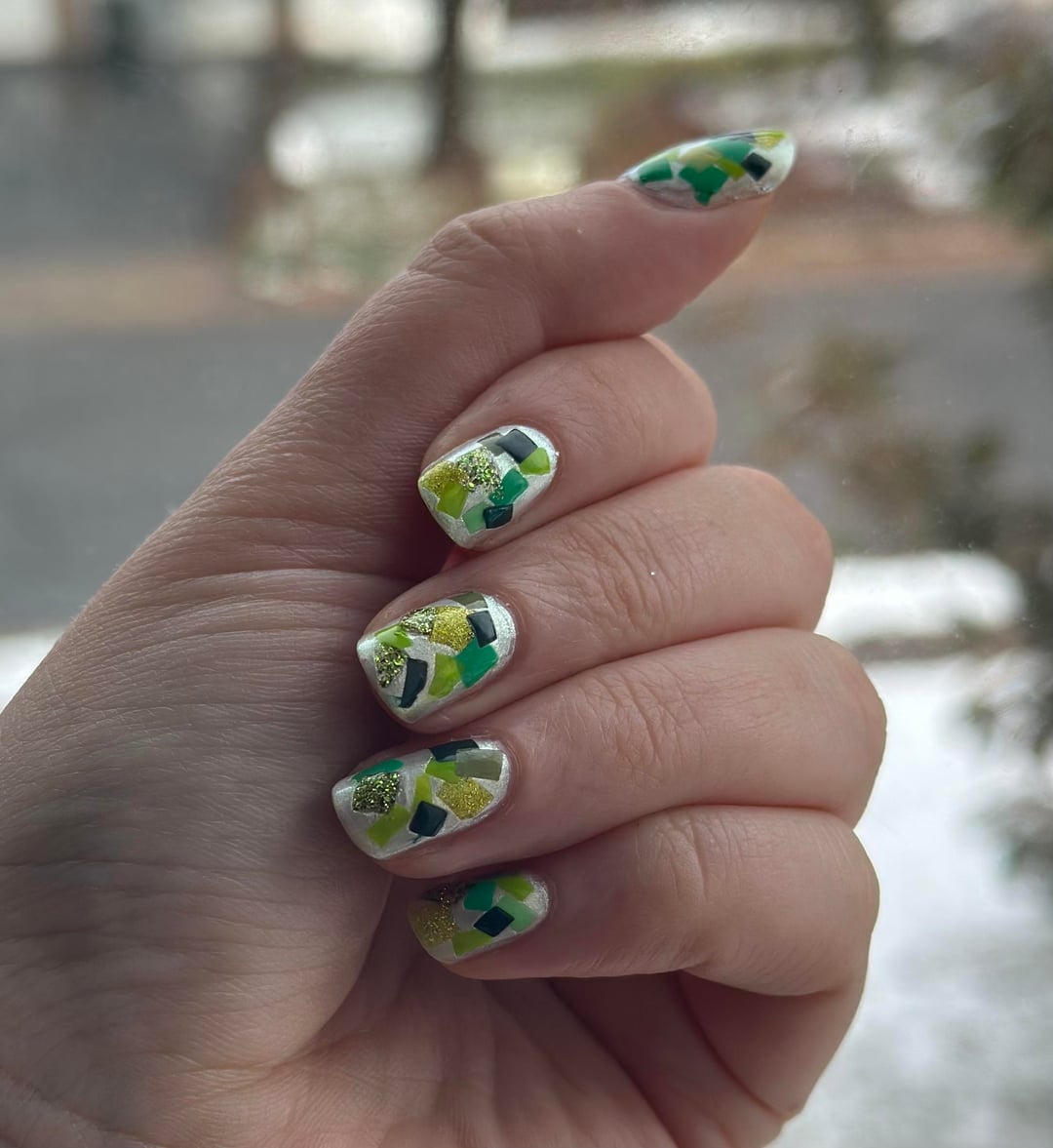 Painted blobs onto a ziplock bag and let them dry completely. Once dried I cut them with scissors into shapes and placed onto wet nails. I then sealed it with top coat.