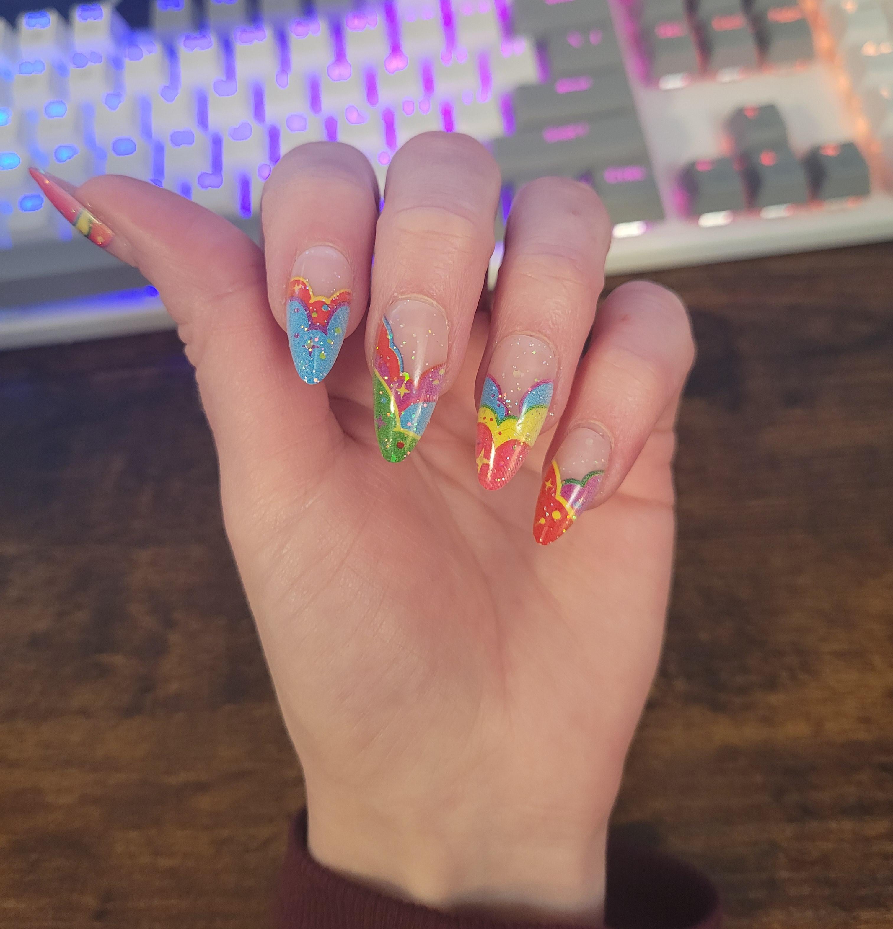 I can never leave long nails on long but they're fun to play with. I ordered a bunch of cheap press-on sets with low expectations, but these with a couple coats of glitter have been making me smile all day (I'm also surprisingly in love with the shape).
