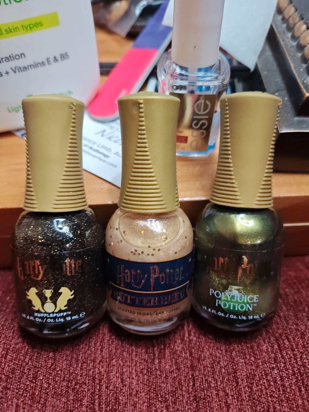 Thumb, middle and pinkie are ORLY×HP Polyjuice Potion (velvetized magnetic) with a single coat of ORLY×HP Butterbeer over top