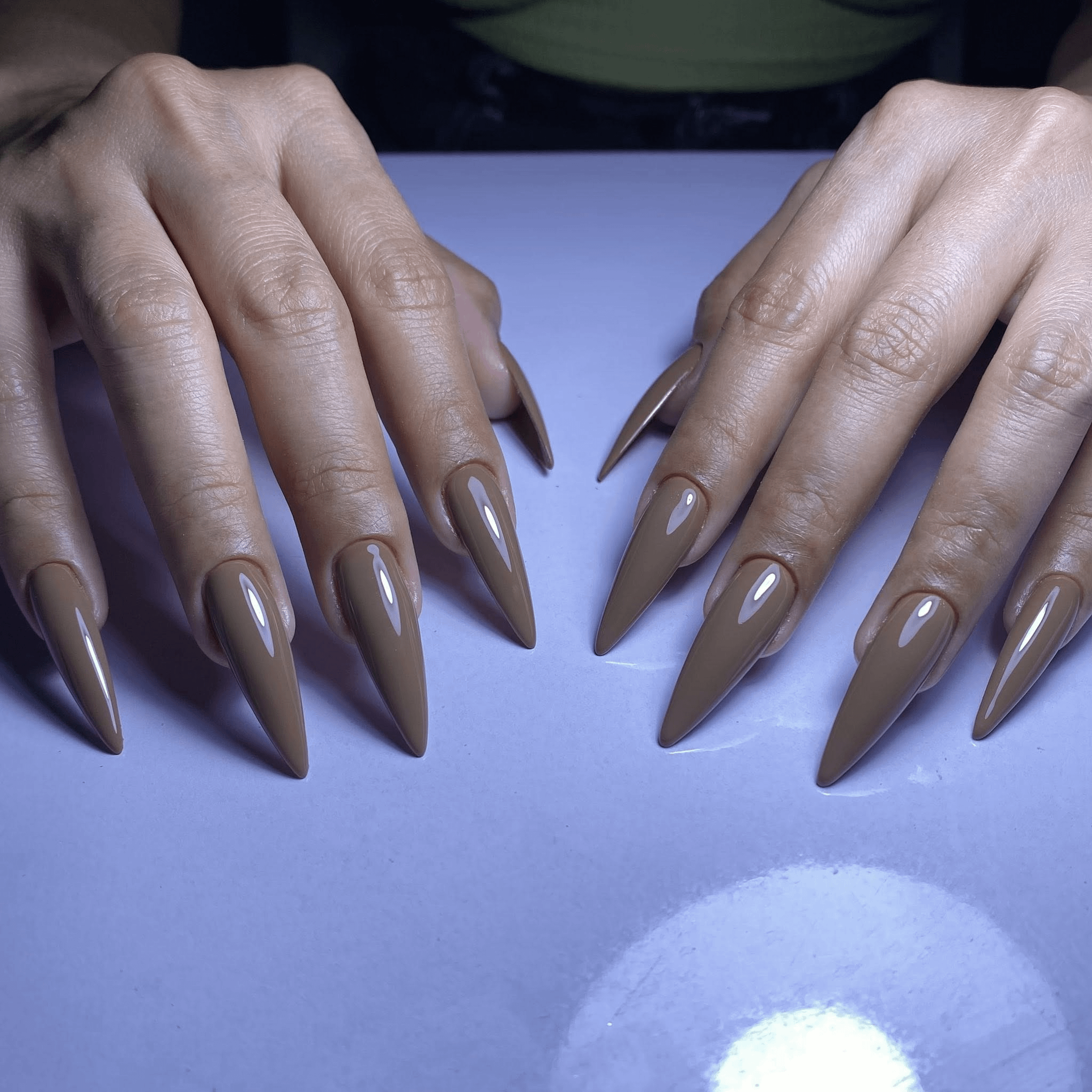 Sometimes a solid color is all you need to let the shape do the talking. I went with a creamy taupe/latte shade to keep it neutral but deadly. Those apexes and points took some time, but the reflection in that top coat makes it all worth it!