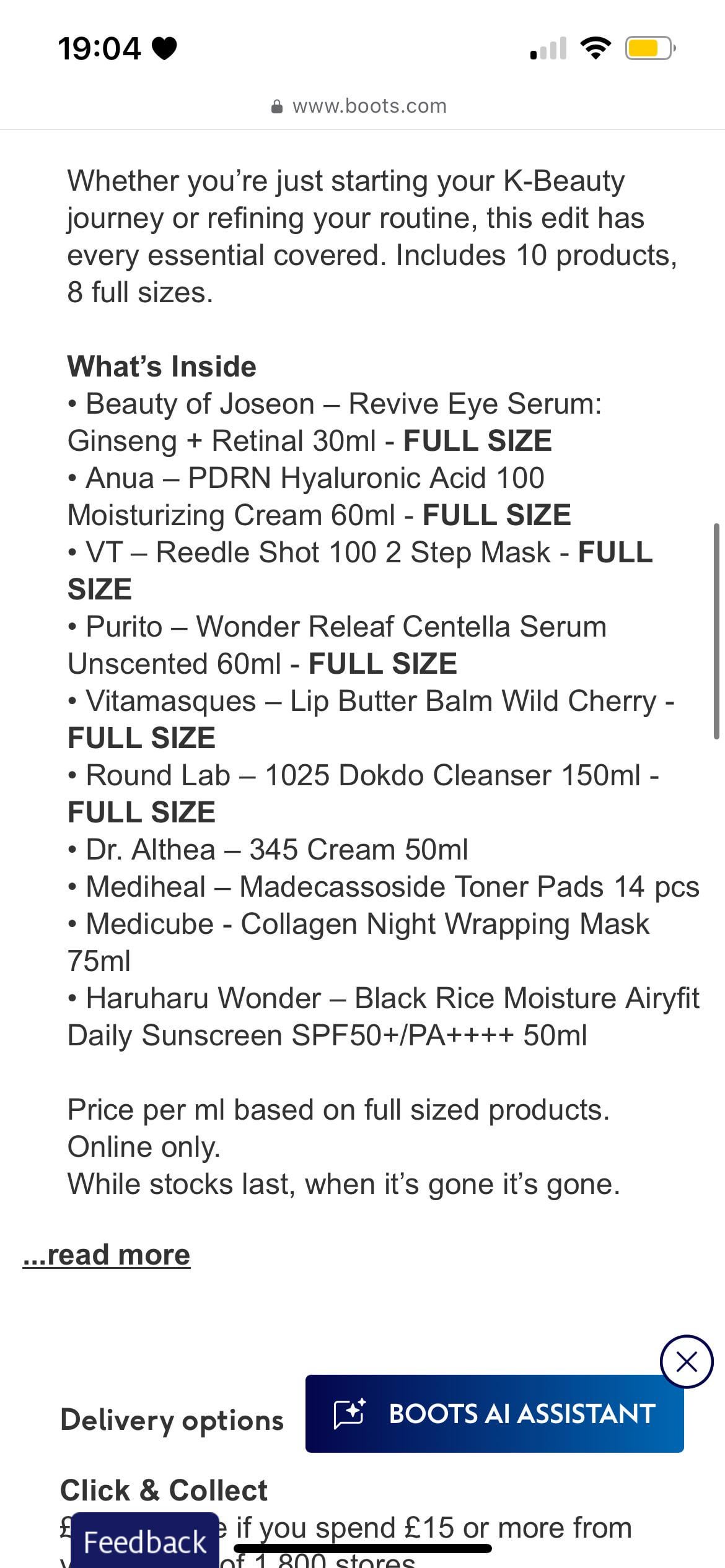 Link [boots](https://www.boots.com/boots-k-beauty-korean-skincare-edit-10385549?traffic=paid.shopping&gclsrc=aw.ds&gad_source=1&gad_campaignid=21096115648&gbraid=0AAAAA-AdmwRz9bP6QV61KGl-puupnhUKh&gclid=CjwKCAjwjtTNBhB0EiwAuswYhkNdNAFKjXZYICrfRhPXgpksgCUbfj_xHspceayM48zOqwQLKutpKhoCb6IQAvD_BwE&fbclid=IwZnRzaAQik8lleHRuA2FlbQExAHNydGMGYXBwX2lkCjY2Mjg1NjgzNzkAAR5GjtcQy6cwCChJO3h8DxfGu-LIITd59VJvJGnDFS6P1fHQr8vfUD9B7UQtKQ_aem_mSd_eVrO03TpWazlCQJCqw)