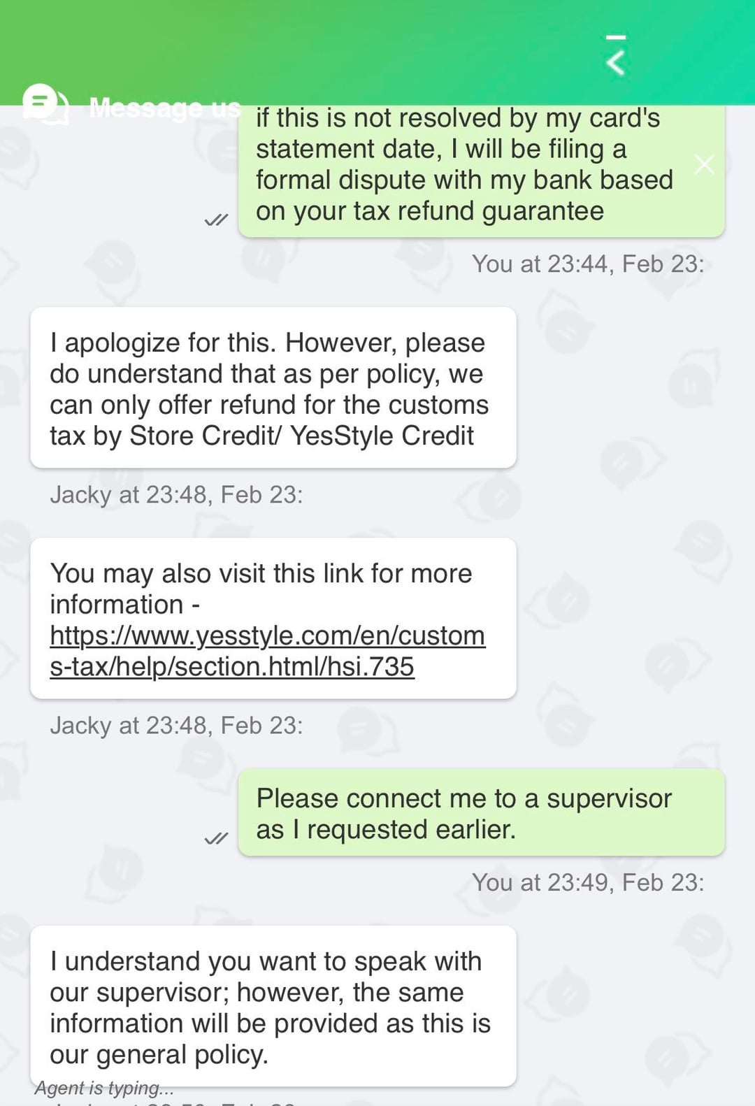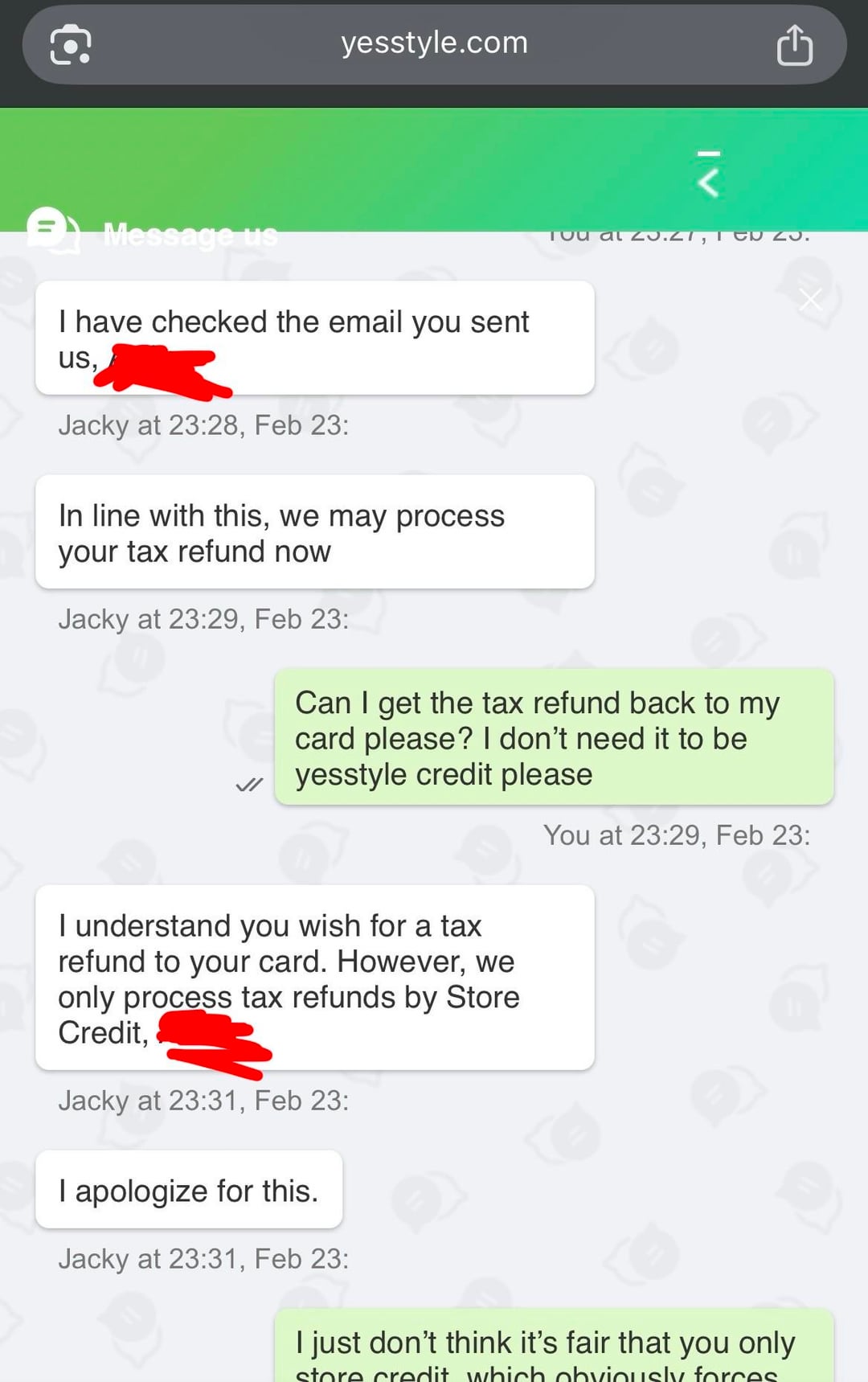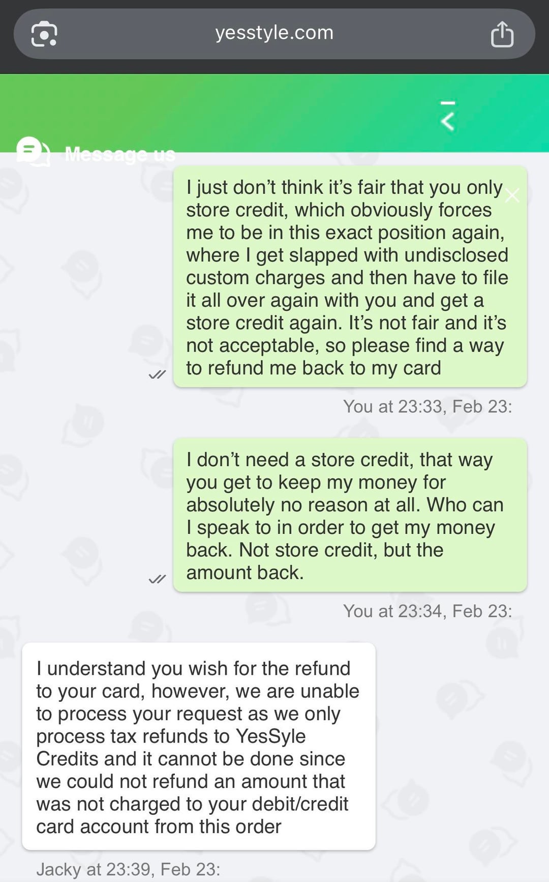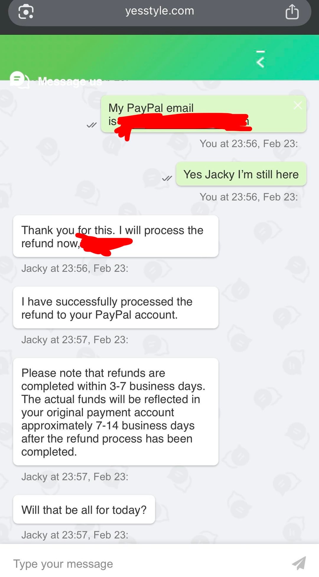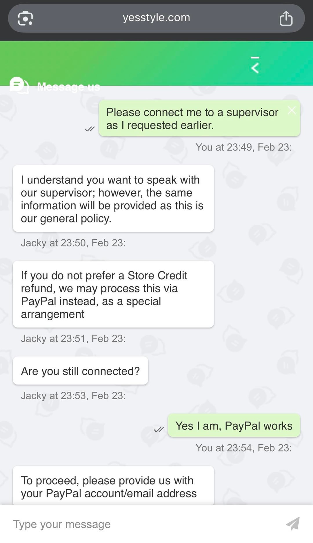 • Feb 23: I jumped on the YesStyle website chat. The rep kept insisting that a PayPal refund was impossible and they could only do store credit. I cited their policy to them and refused to accept store credit