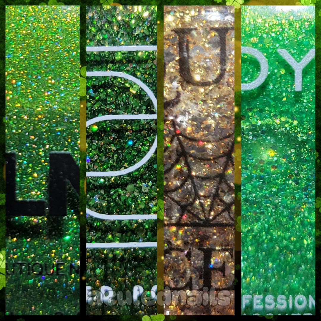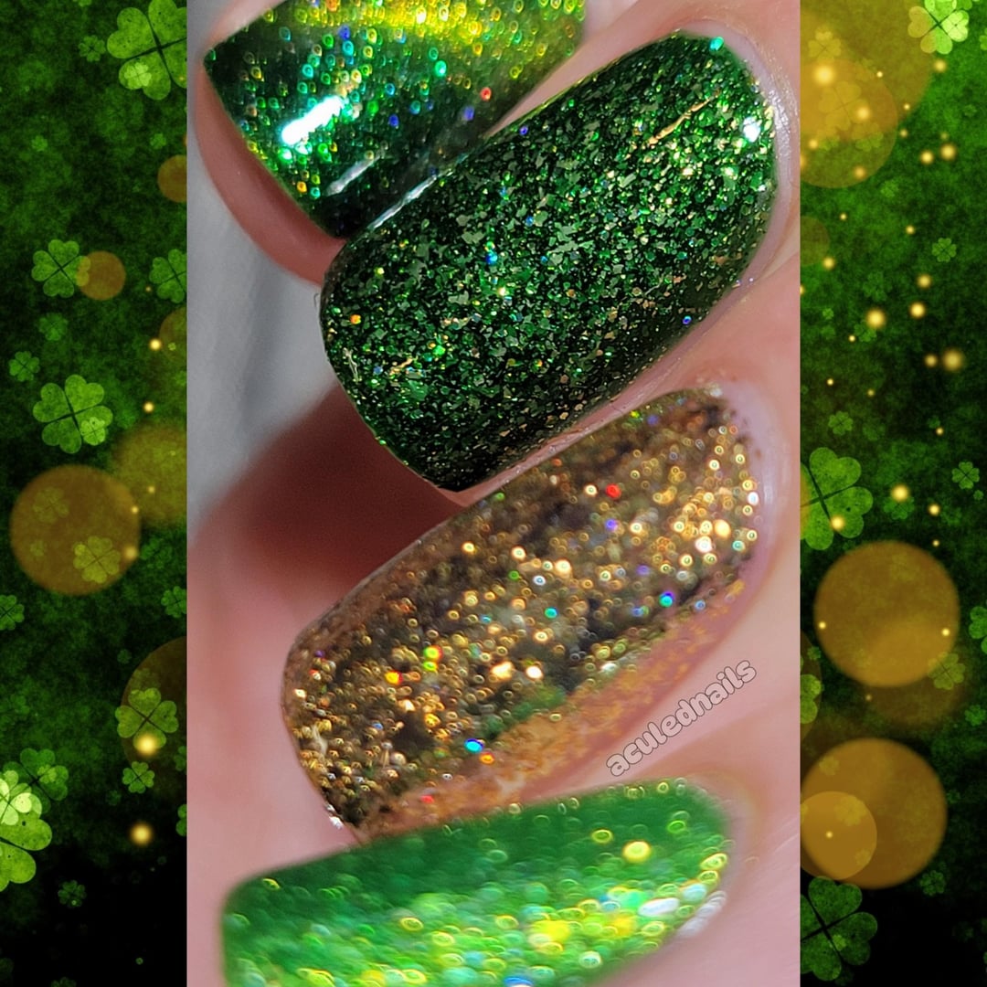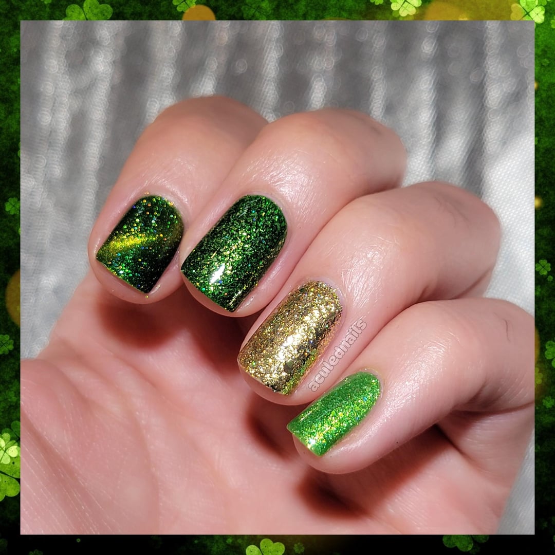Of course, I had to go with St. Paddy’s colors for this weekends skittle. I pulled out all my green gold and orange bins and ended up really loving this vibrant grassy clover green, rather than a cooler emerald vibe, which I naturally lean to. It always needs paired with gold, and there is no better slap yo mama gold than Lacquistry’s holiday gold flake fest. Its kinda funny that all of these are for holidays, which 2 actually being St. Paddy’s polishes, with the Gold from Christmas, and Frankie from Halloween. They all still work 😝. The amount of sparkle in all of these is somewhat absurd. Holo, flakie, reflective, its a fucking SHINY fest….my favorite kind of fest 😝🍀🌟