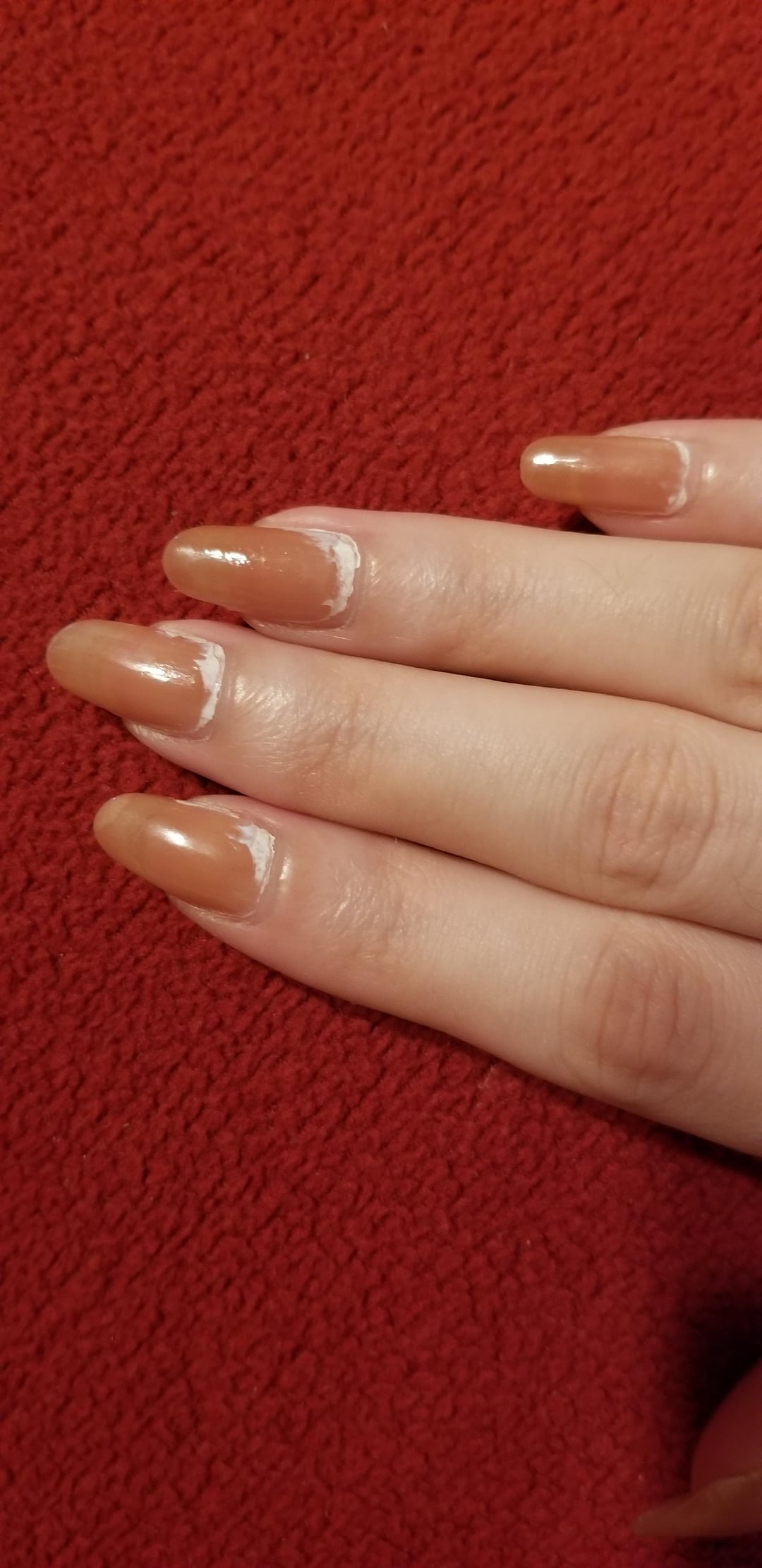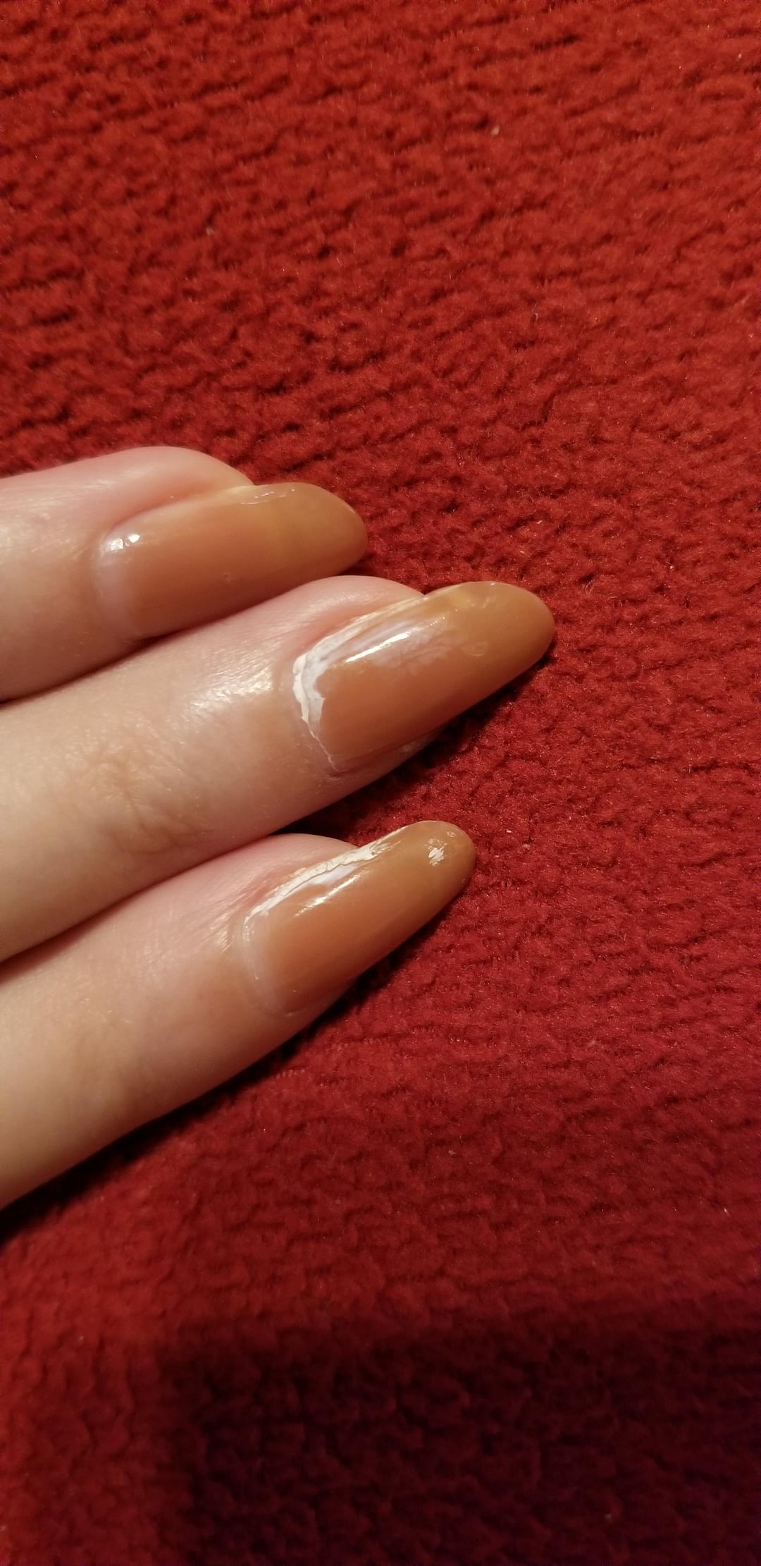 These white edges suddenly appeared on and around my polish just now. It looks like there's a substance on top, but it can't be scraped off. The only thing I was handling that I think it may be was 90% rubbing alcohol trying to clean off sticker residue. Is this a known reaction? And can it be fixed without removing the polish? Just to be clear, this didn't happen over time. I just painted them a couple of days ago and they were looking great, and this just abruptly appeared. I'm wearing Canmake polish in N70 Rose Milk Tea if it matters, with ORLY Rubberized Bonder base coat and Sally Hansen Hard as Nails top coat.