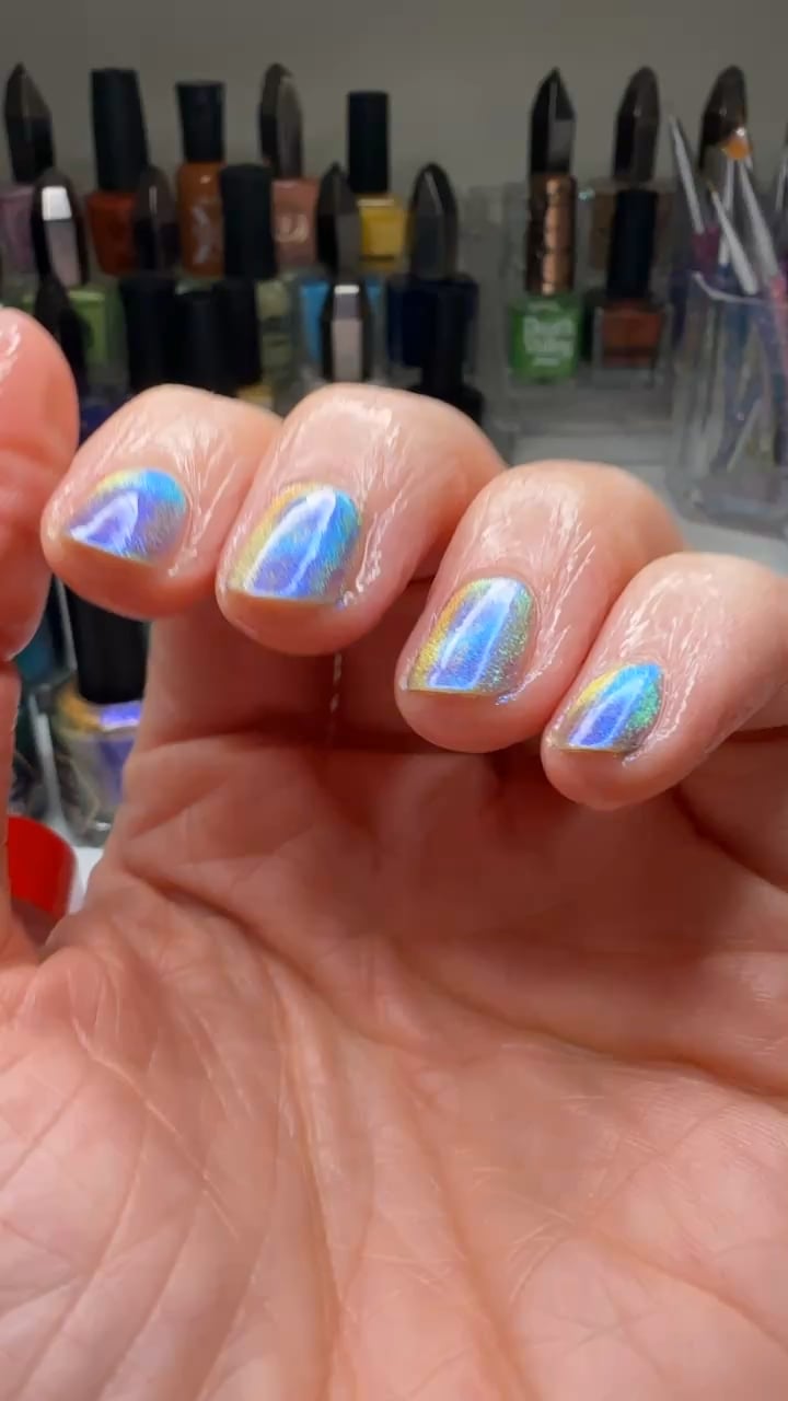 I did one coat of glisten and glow glitter grabber as my ridge-filling base, one THIN layer of each polish side by side (vertical) and the magnetized in glass bead style for about 30 seconds, 1 layer of Cracked QDTC also magnetized for about 30 seconds