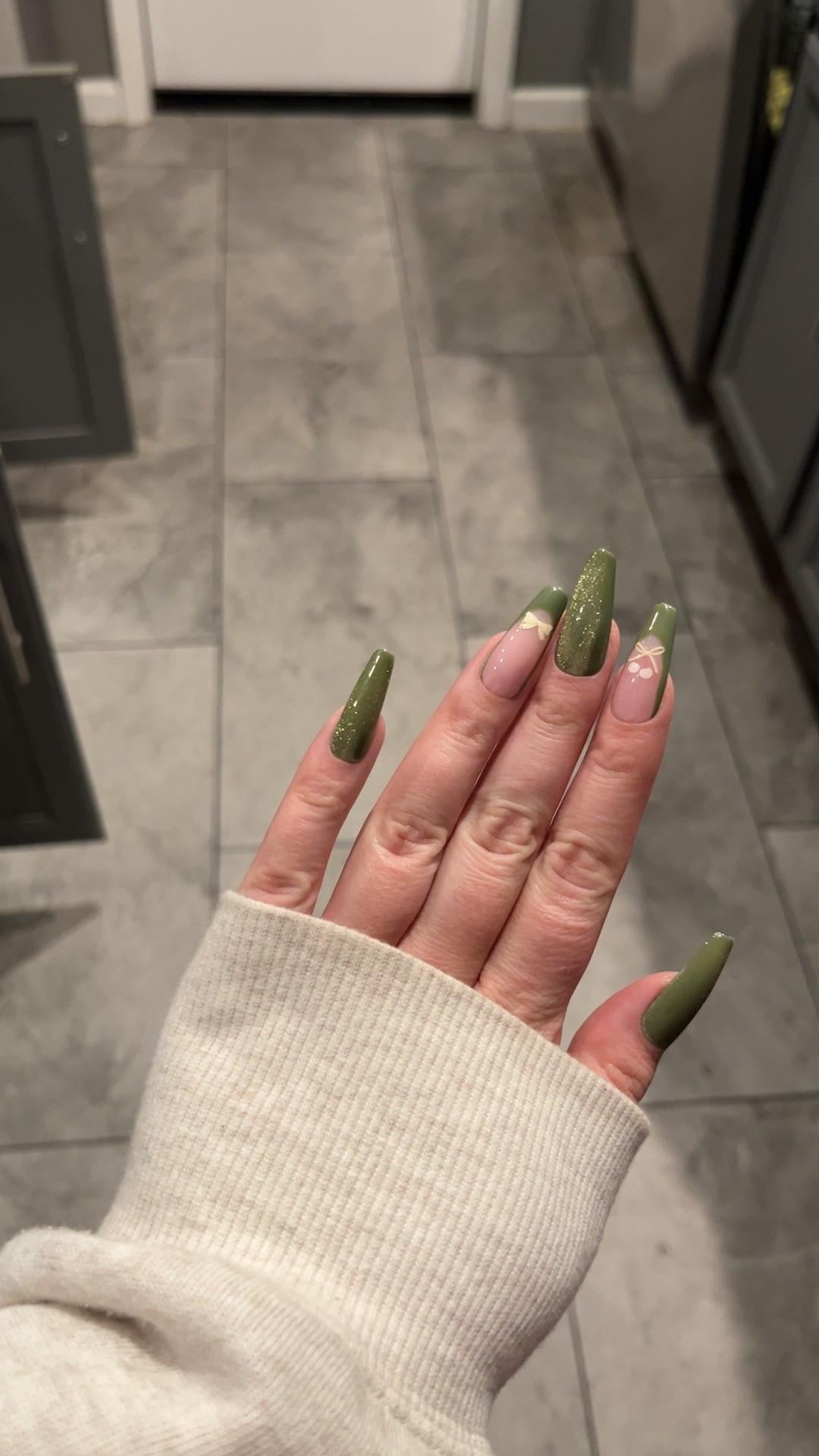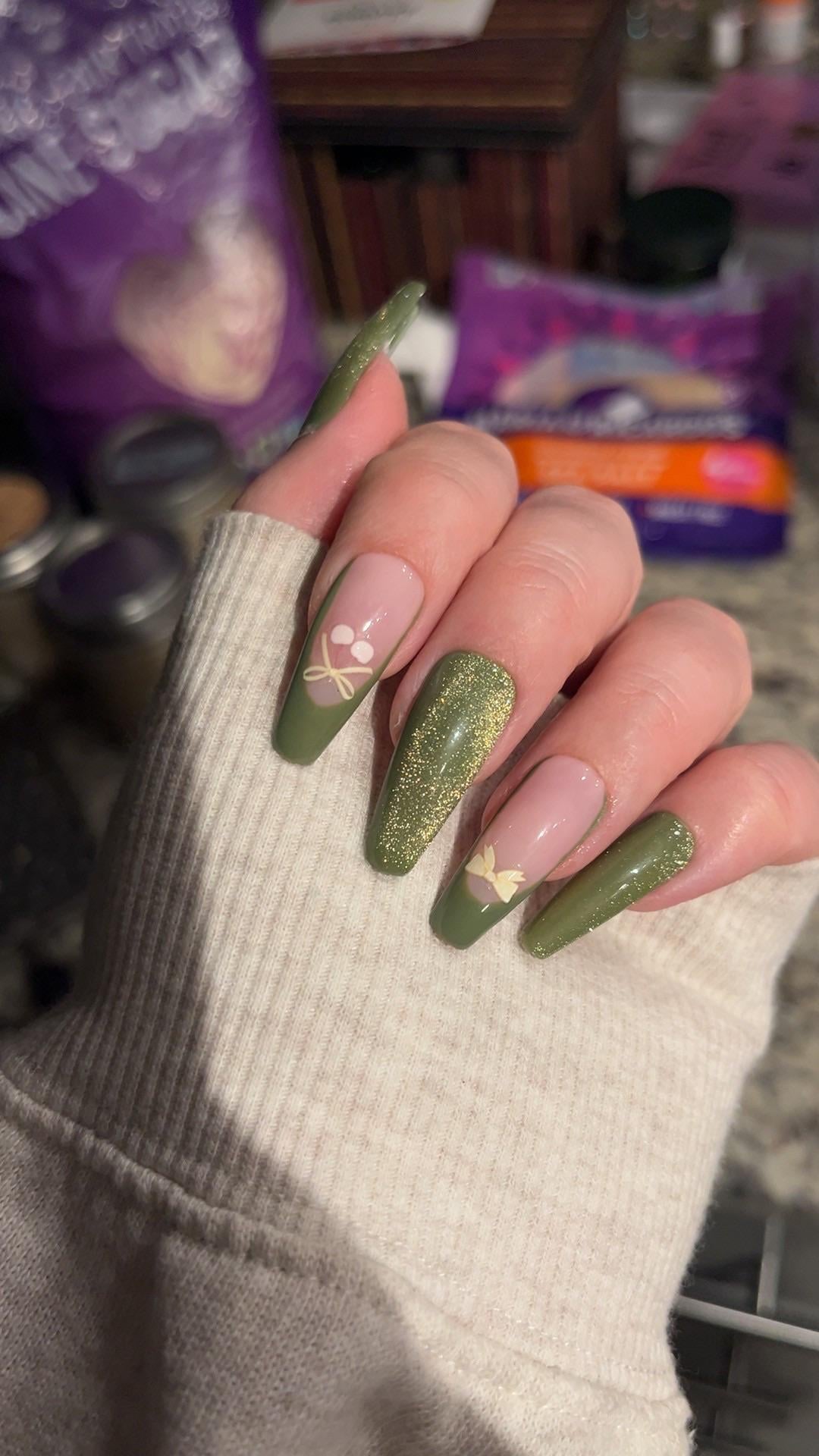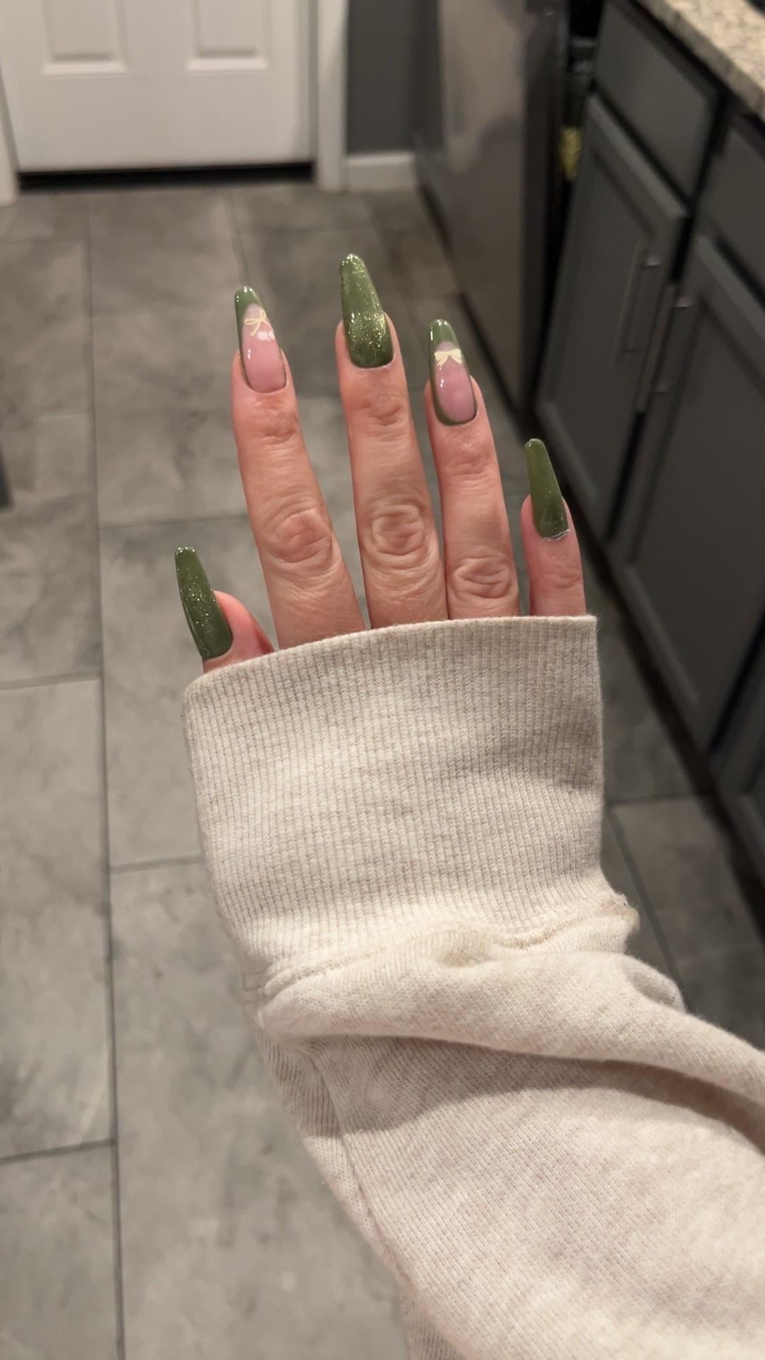 My first time doing cat eye and painting my own frenchies! (The bows are stickers) by thescorpiotarot-ess