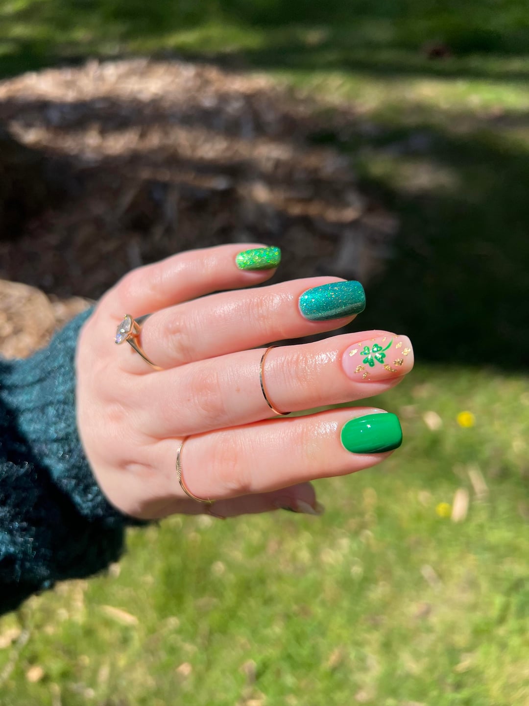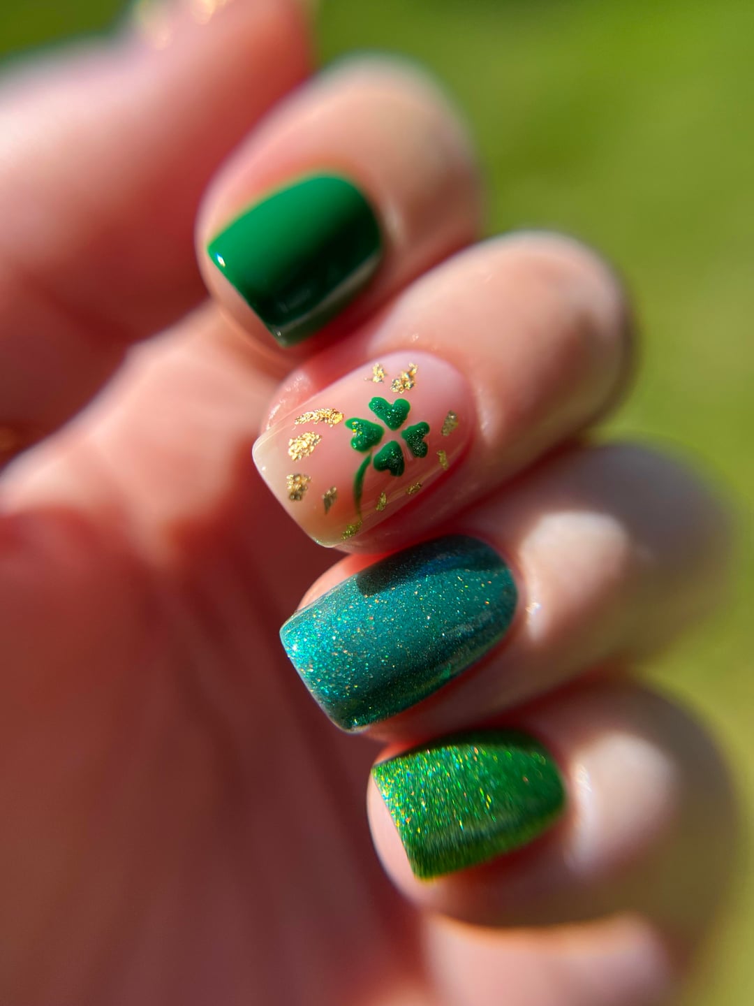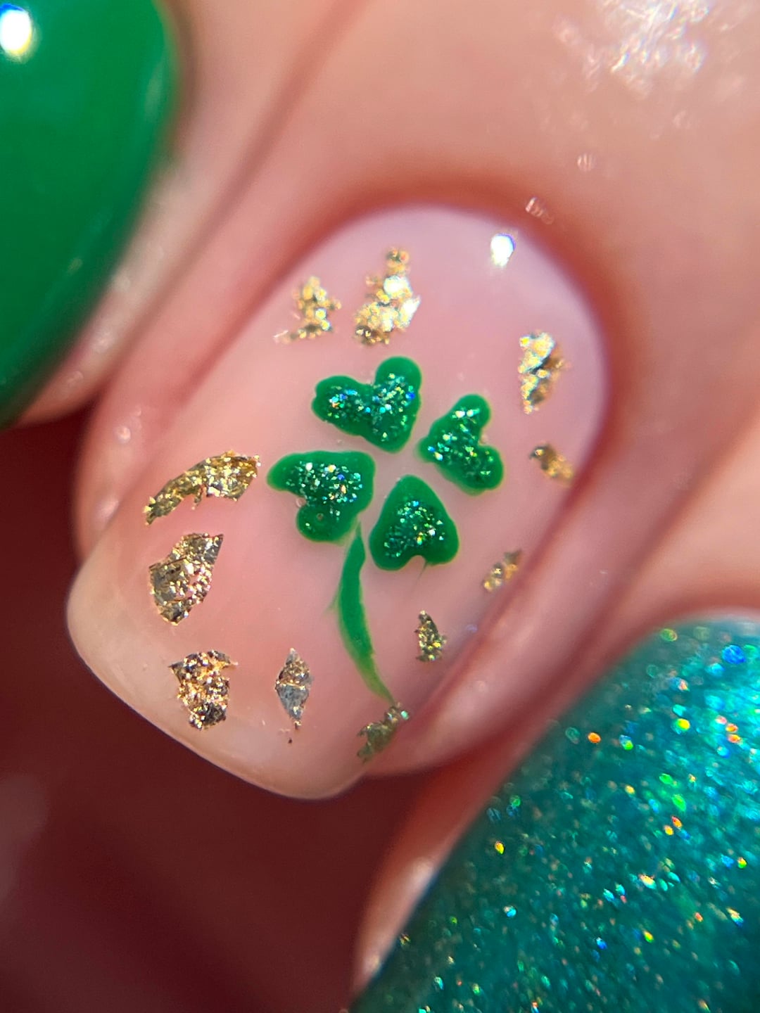 base color: cirque chiffon pointer: dnd 4 leaf clover ring: detour lucky charm pinky: apocalypse radioactive shamrocks are dnd & apocalypse + young nails gold flakes topcoat: cracked QDTC by msteacher22