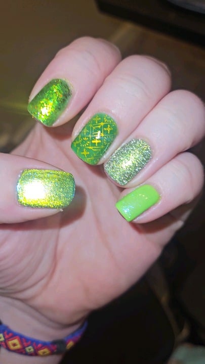 Right Hand Colors (pinky to thumb) – 3x Tyler's Trinkets Reanimated, 3x Emily de Molly Forces of Nature, 4x LynB Matcha Latte (stamped with 1x maniology Apple Crisp, maniology plate M014), 4x Sinful Colors Call You Later, 3x Pepper Polish Source of Life (magnetized velvet style, 30s each coat with 30lb horseshoe mag)