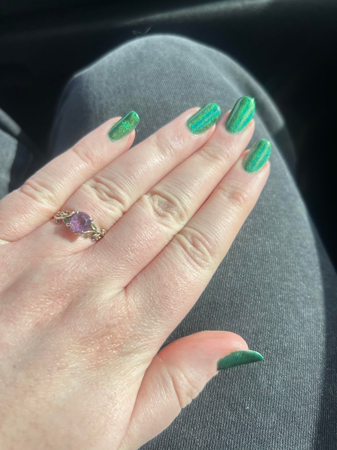 **Second mani- 1x OPI Natural Nail Base Coat, 1.5x Holo Taco Green Taffy, 1x Sally Hansen Insta Dri Top Coat**