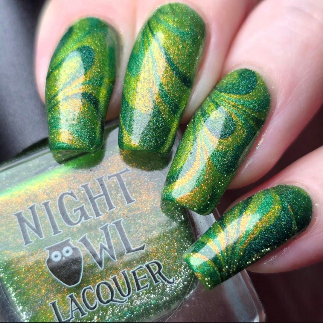 St. Patrick water marble manicure Night owl lacquer The Legend, Holo taco Green Taffy and Lost in the Woods