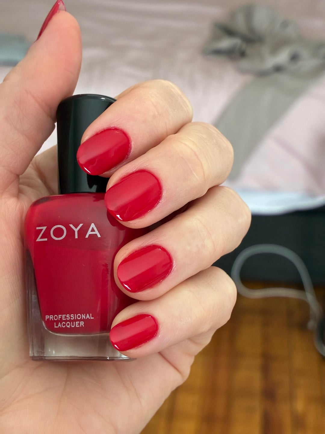 This polish in person is a little bit more muted and leans toward true red. This was one coat of base, 2 coats of polish and one coat of fast drying topcoat. In the pictures it also looks more sheer than I see in person. It is pretty full coverage in person. I used it in my mani and pedi today, getting ready for spring/summer sandals!
