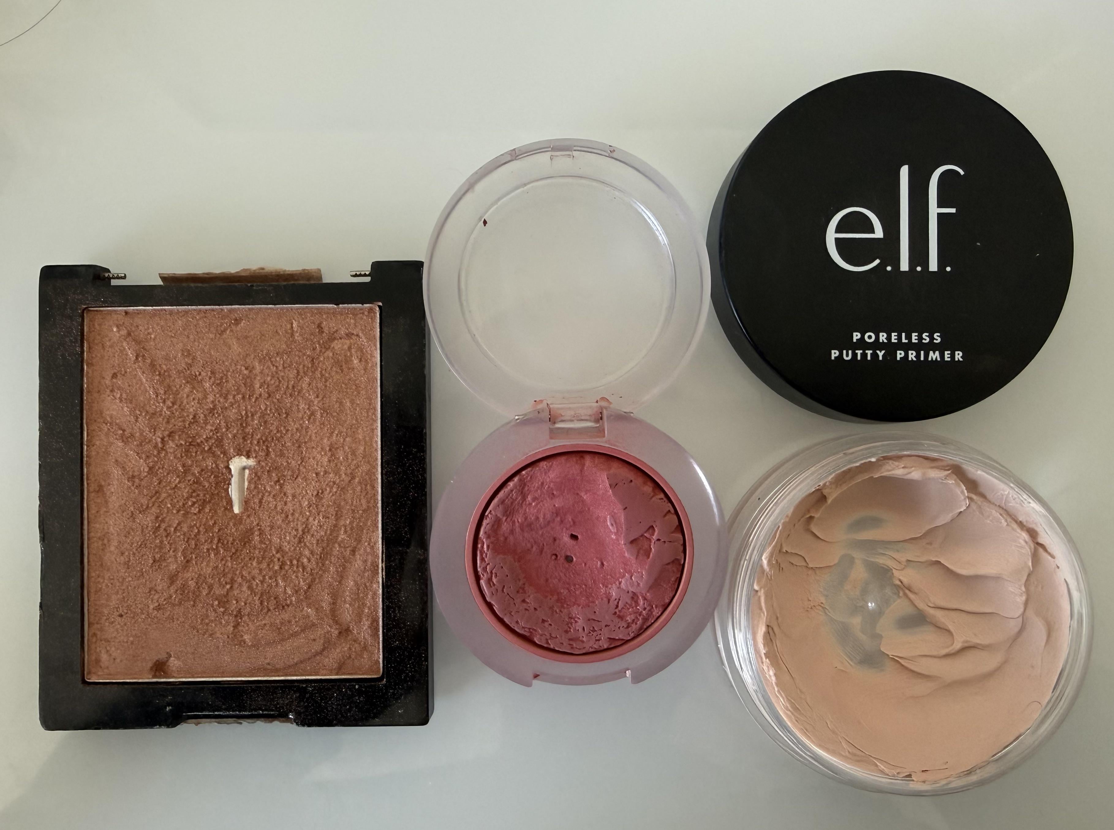 Wet n wild coloricon bronzer, Clinique cheek pop/blush pop in the shade rosy pop, and the elf poreless putty primer – they are 3-4 years old and definitely expired, I used the blush since high school and I’m a junior in college now 🥲