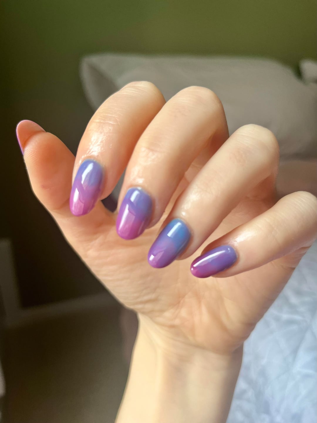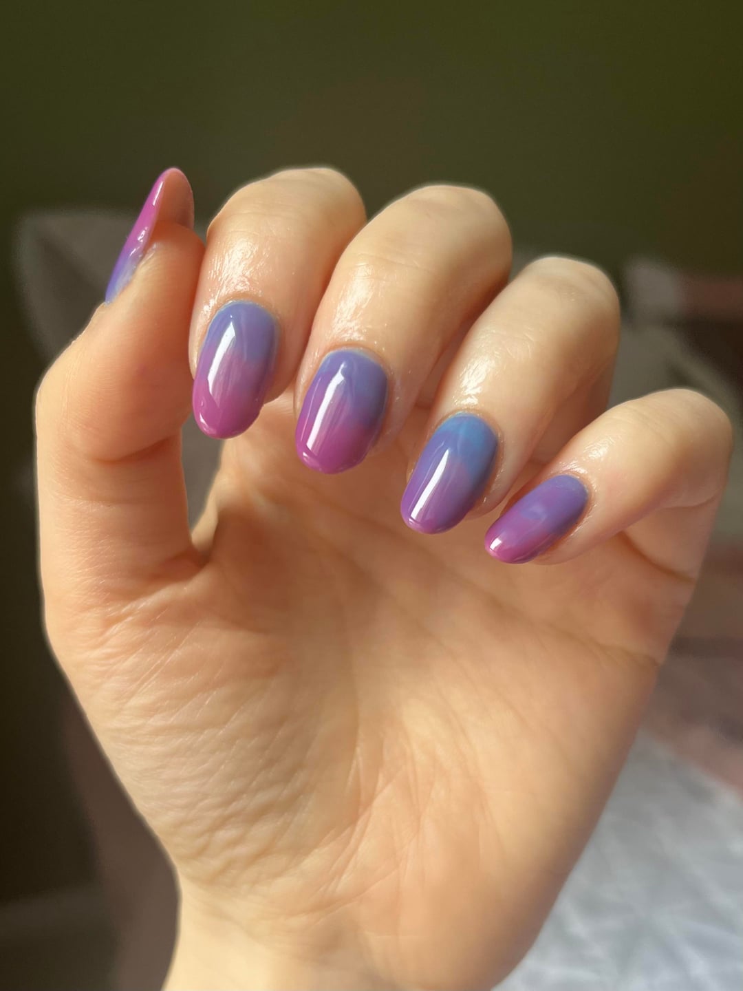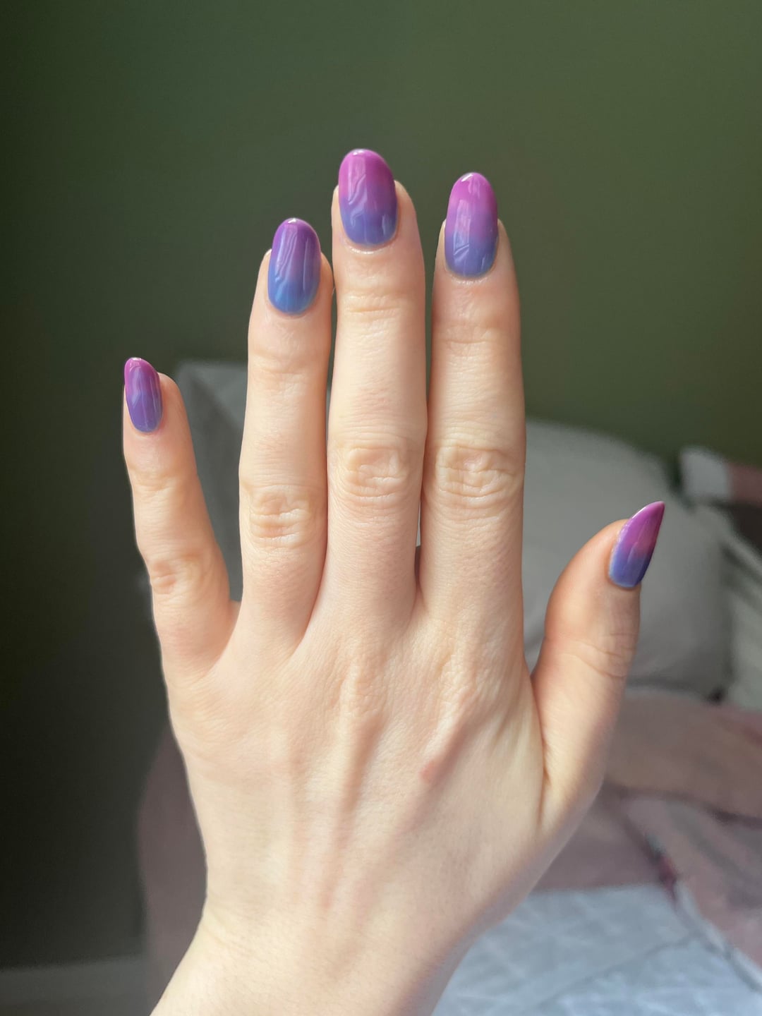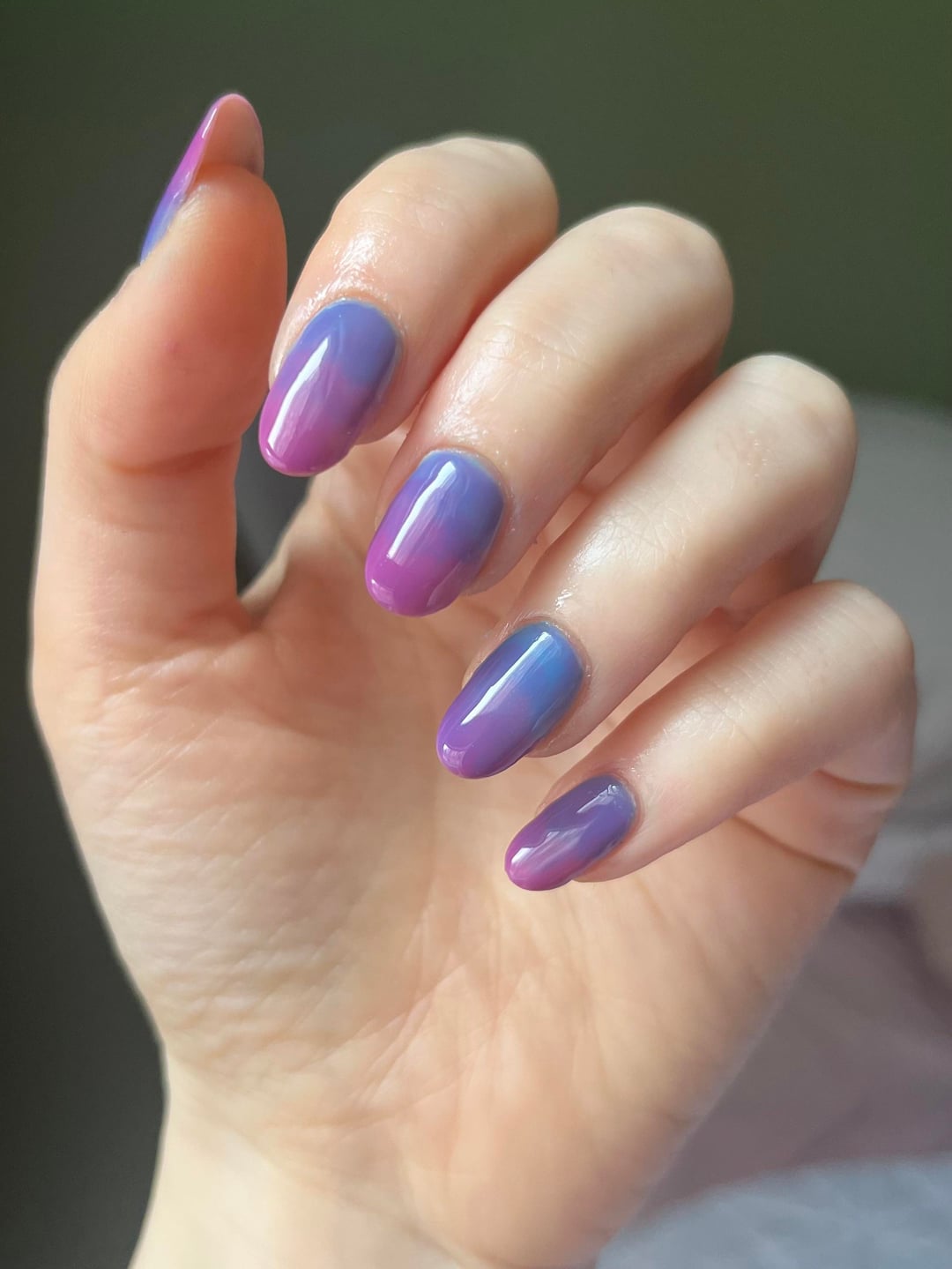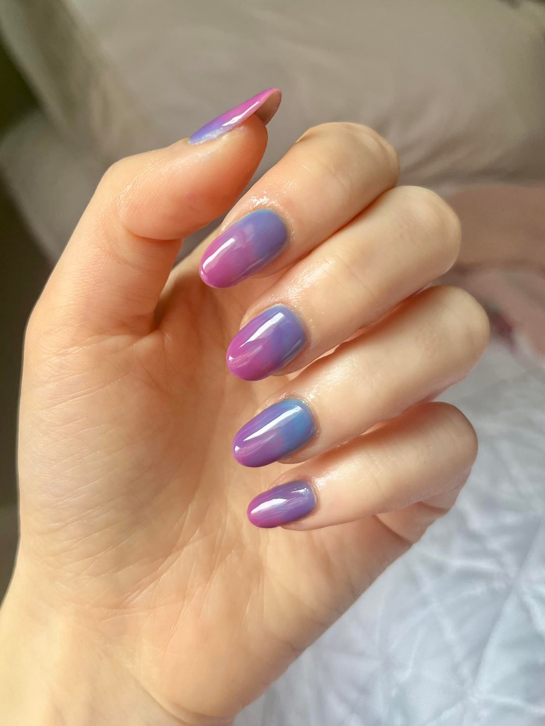 Obsessed with this lazy gradient (mixed all colours on the nails in two layers until I was satisfied with the result) 🤩 Kind of looks like the bi pride flag, so solidarity with all the bisexuals out there from a lesbian 🤝