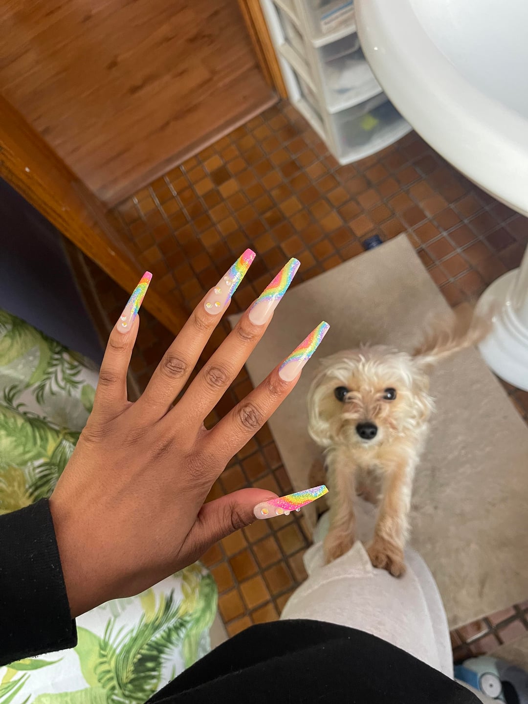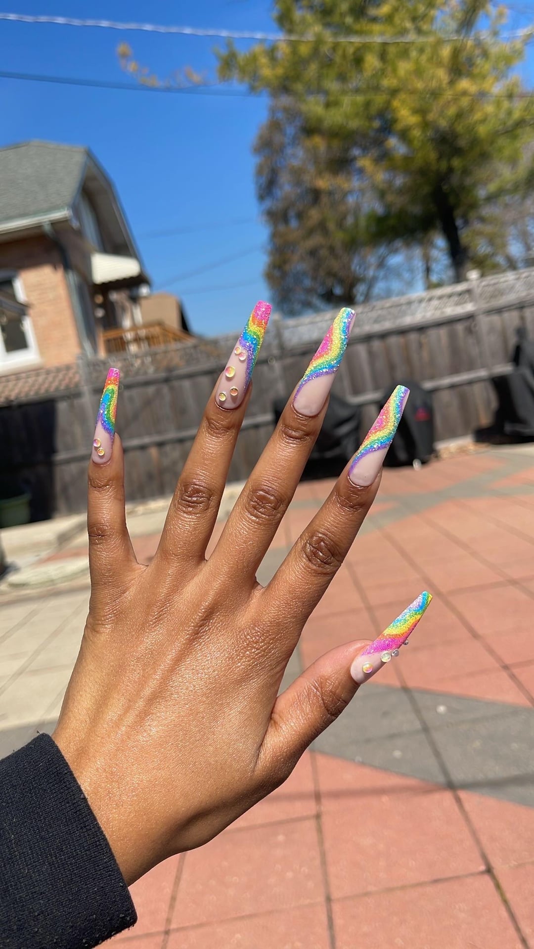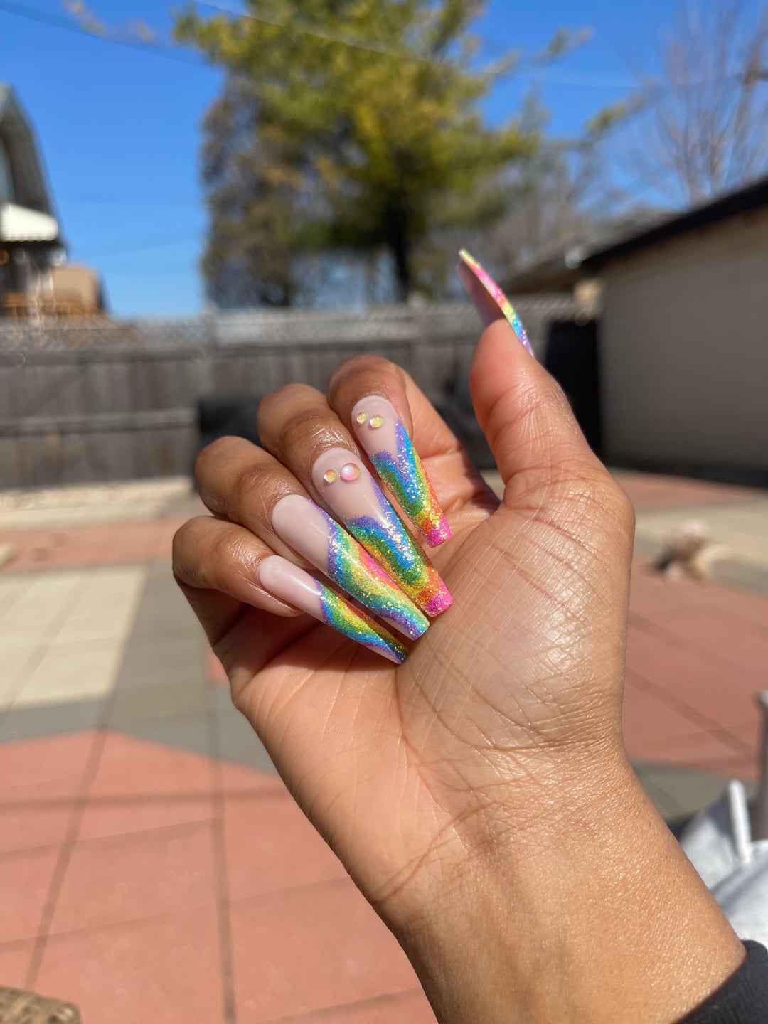 Glitzy 3D Handmade Press-On Nails in Rainbow Sugar Glitter French (3X-Long Coffin) from Gold Finger!