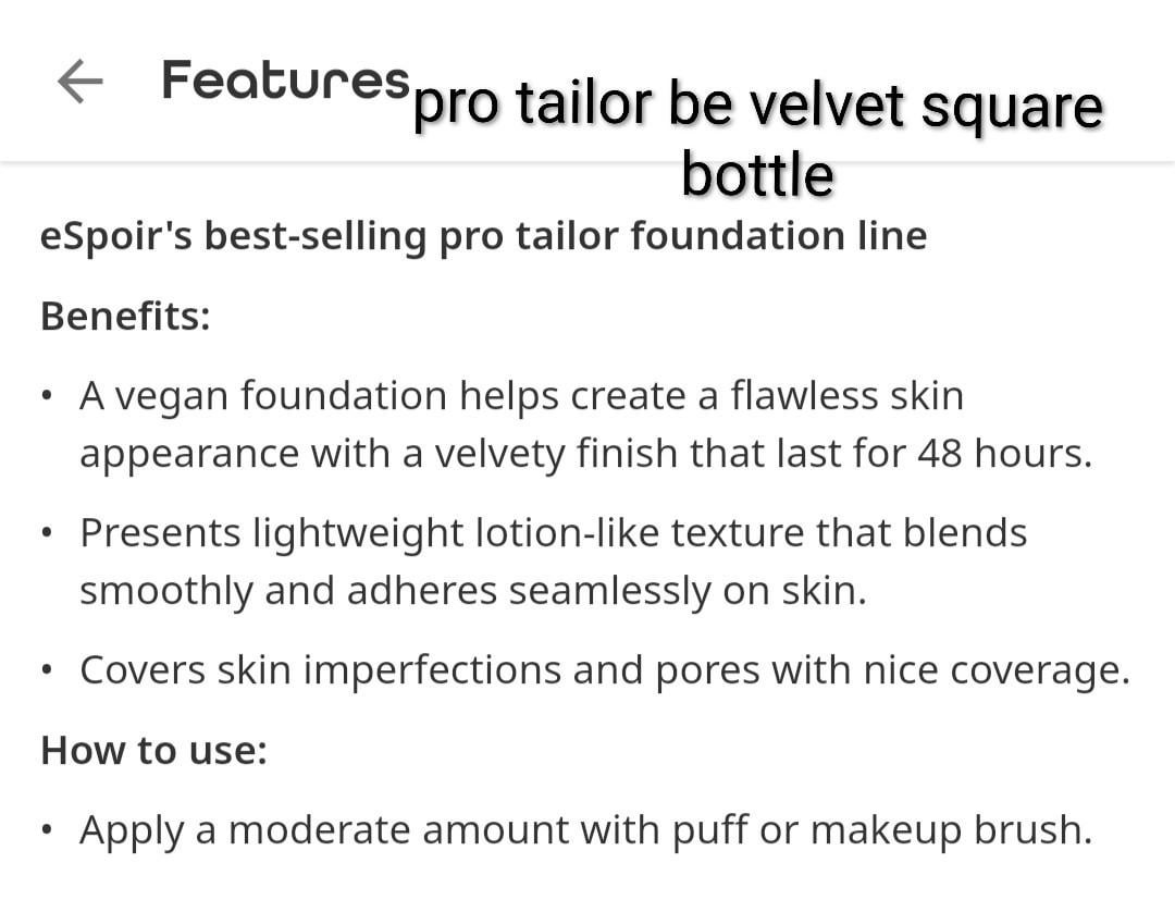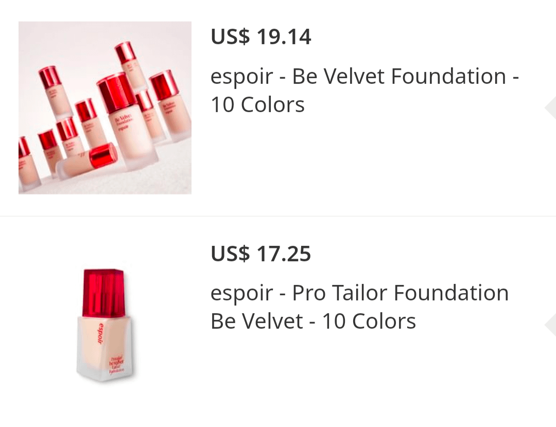 I got a tester pack of the espoir be velvet cushion. foundation. it came with little pouches of the liquid in all different shades. I've tested it and I really love the formula. it's the first matte foundation I've tried that DOESN'T cling to and accentuate my dry patches. I'm doing wear tests right now to make sure it wears well throughout the day and doesn't start looking bad, but I think I'll probably want to buy a full size. I wanted to get the fluid version of the be velvet formula in a bottle rather than the cushion cause it seems like a much better price per ounce value. But it seems like there are two versions of it to buy and I have no idea if there's a difference in formula, and which one is more similar to the formula in the cushion. I also can't find out which one has more product for the price…please let me know if you have any idea or information about these.