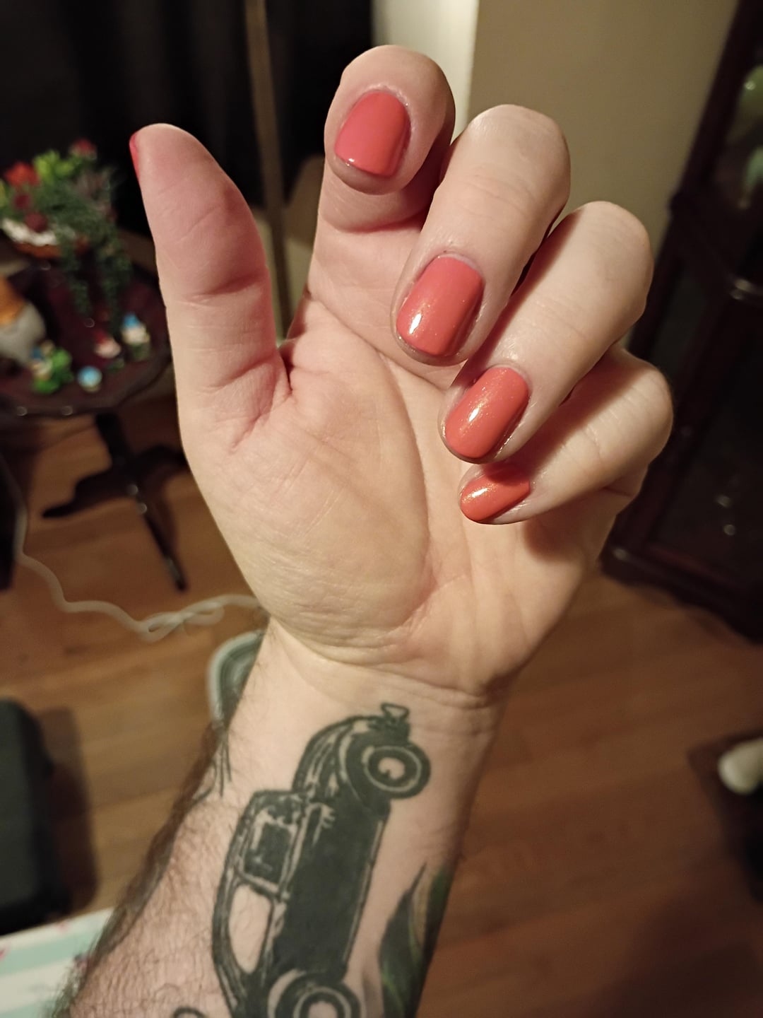 I'm finally back home as of yesterday, and this evening decided a little self care was a must. This salmon-pink with gold shimmer feels like it fits the season well. It's one I've been holding onto for years but have never worn, but feels like it was made for this moment.