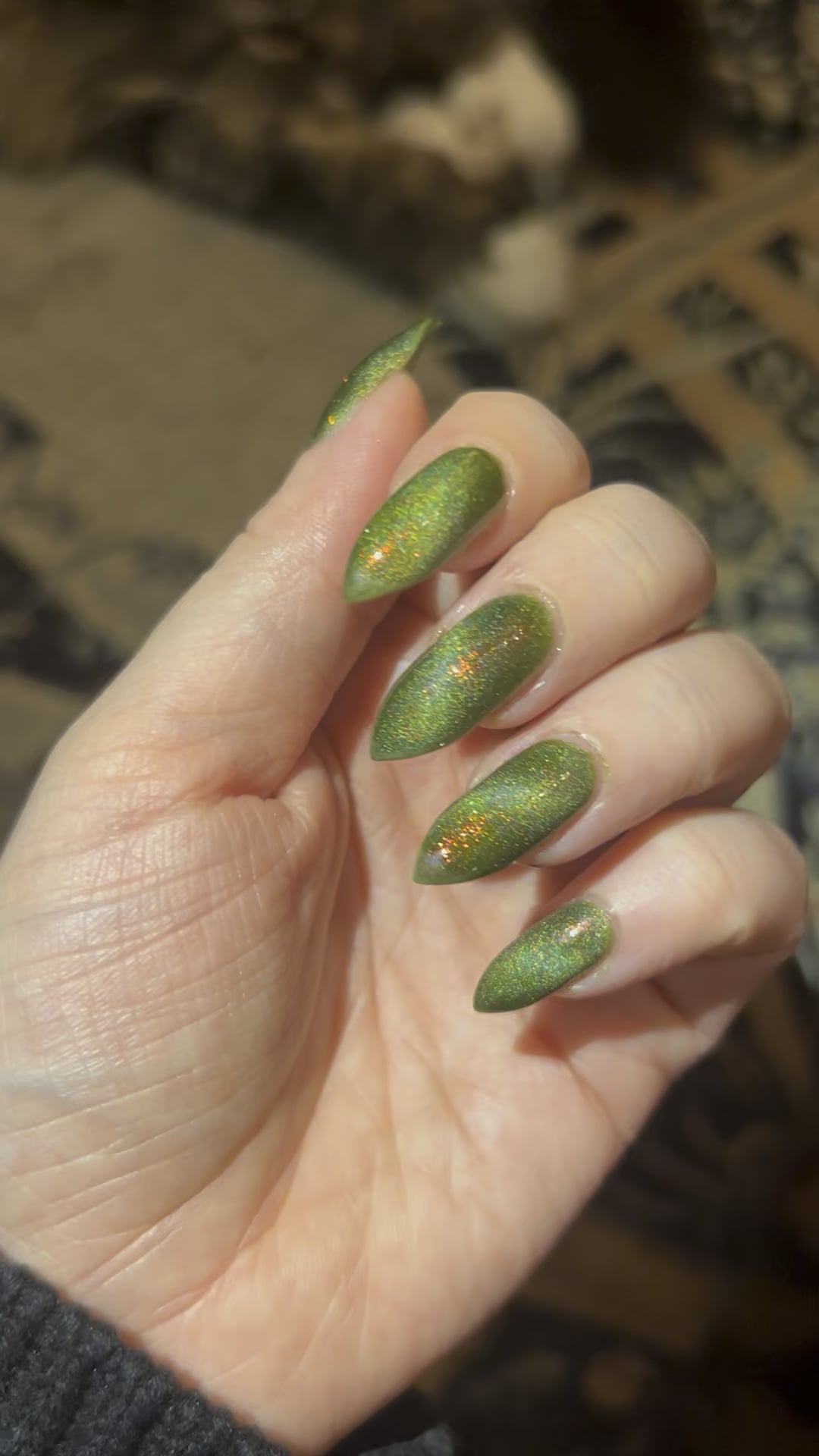 Wizard Oil! Y’all know my green goblin ass had to have it. And holy wow the Arcana witches put their backs into this shrimp sibling spell, and just to my taste too, this color palette is everything. The magnetic is reactive but the holo makes for a softer effect, like magic fog over a vernal pool. I’m OBSESSED.