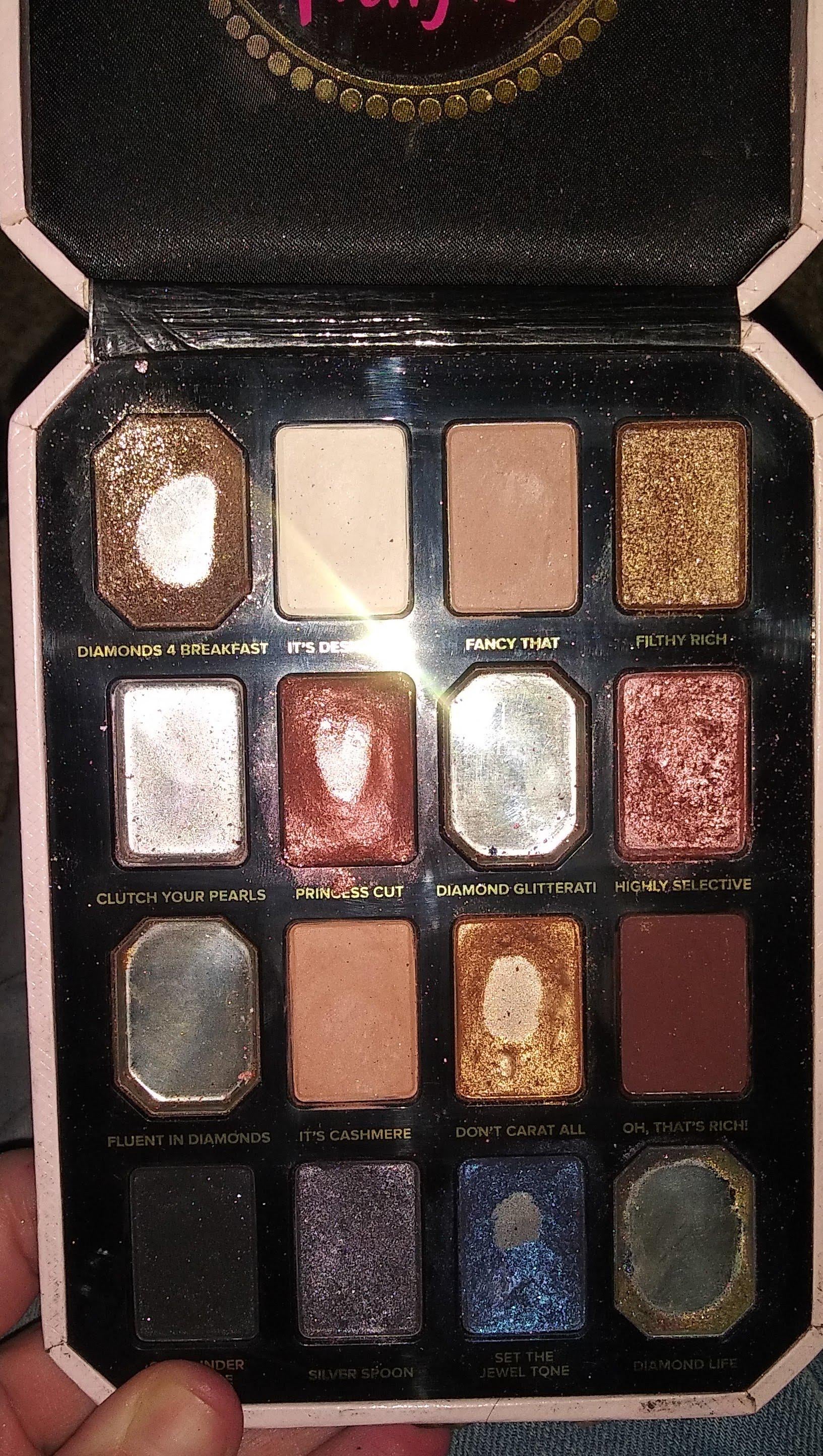 Clutch your pearls was my favorite shade. I've had this palette since 2021. I rarely reach for her as much but I still like to use the shimmers and the dark matte brown shade. The product is Pretty Rich by Too Faced Cosmetics.