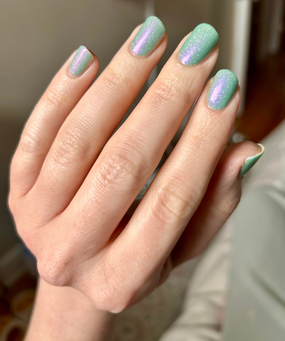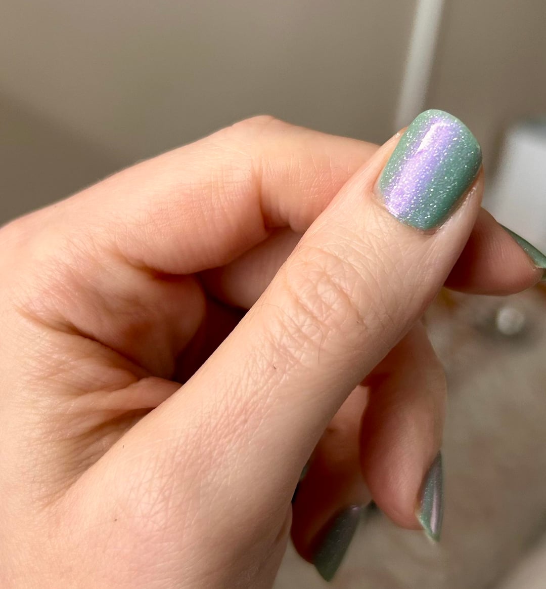 In the last photo you can see: Nettle and Briar, Floral Frenzy, and The Fields and Forests of my Youth. Nettle and Briar does not have reflective glitter and its shift is more red/magenta, although the base green is nearly identical. The Fields and Forests of My Youth has a warmer and slightly deeper green base but similar purple shift with reflective glitter.