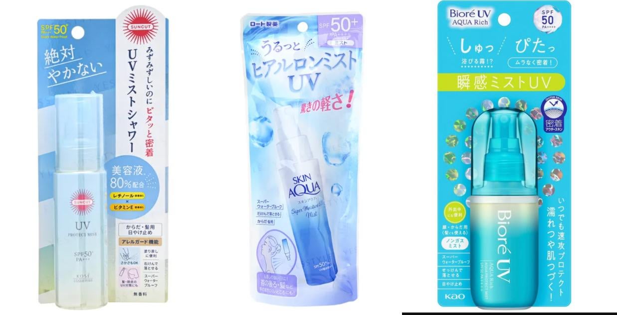 (Pictured above: Biore UV Aqua Rich Aqua Protect Mist SPF50+ PA++++, Skin Aqua Super Moisture UV Mist SPF50+ PA++++, Kose Suncut UV Protect Mist SPF50+ PA++++)