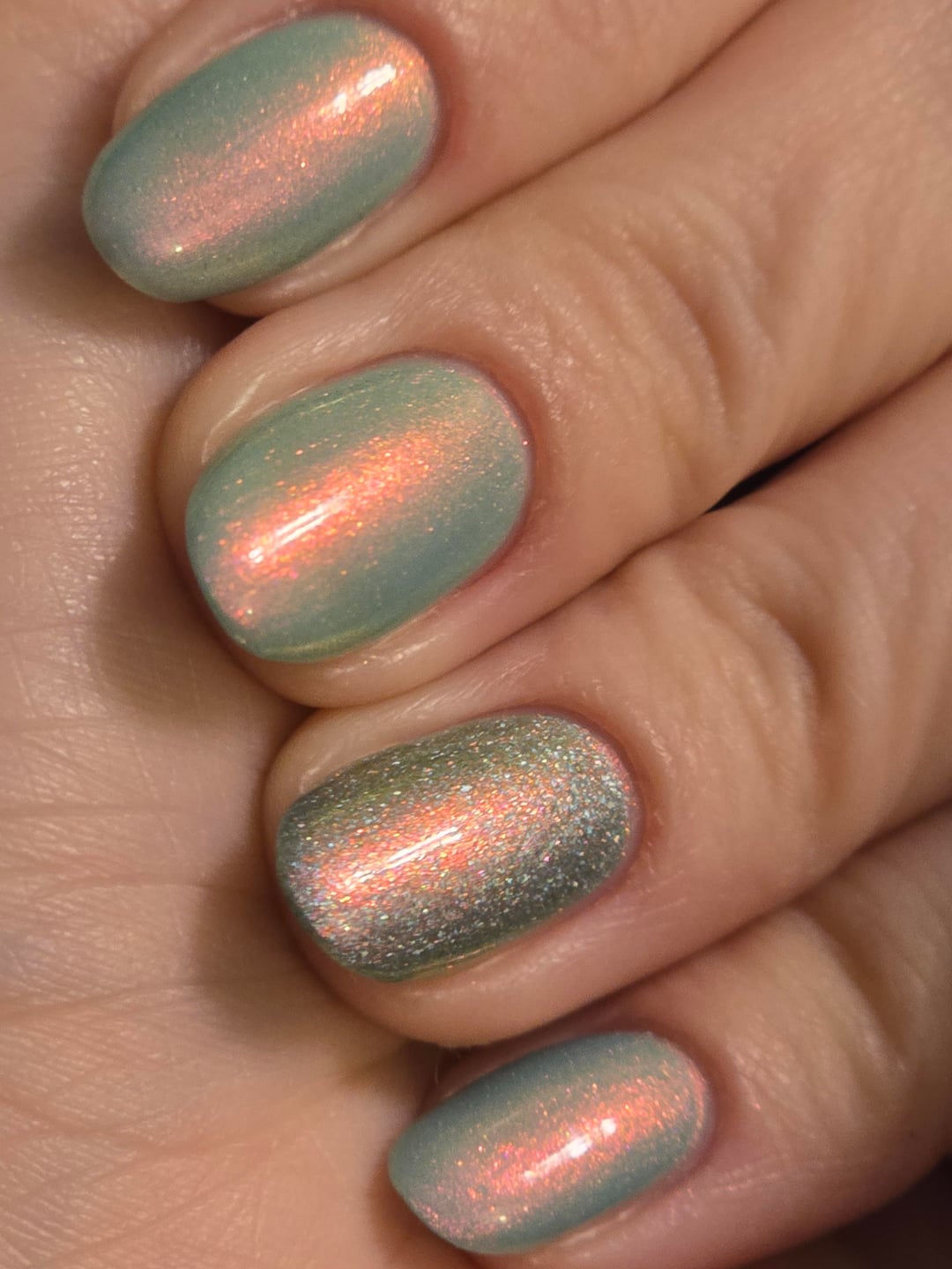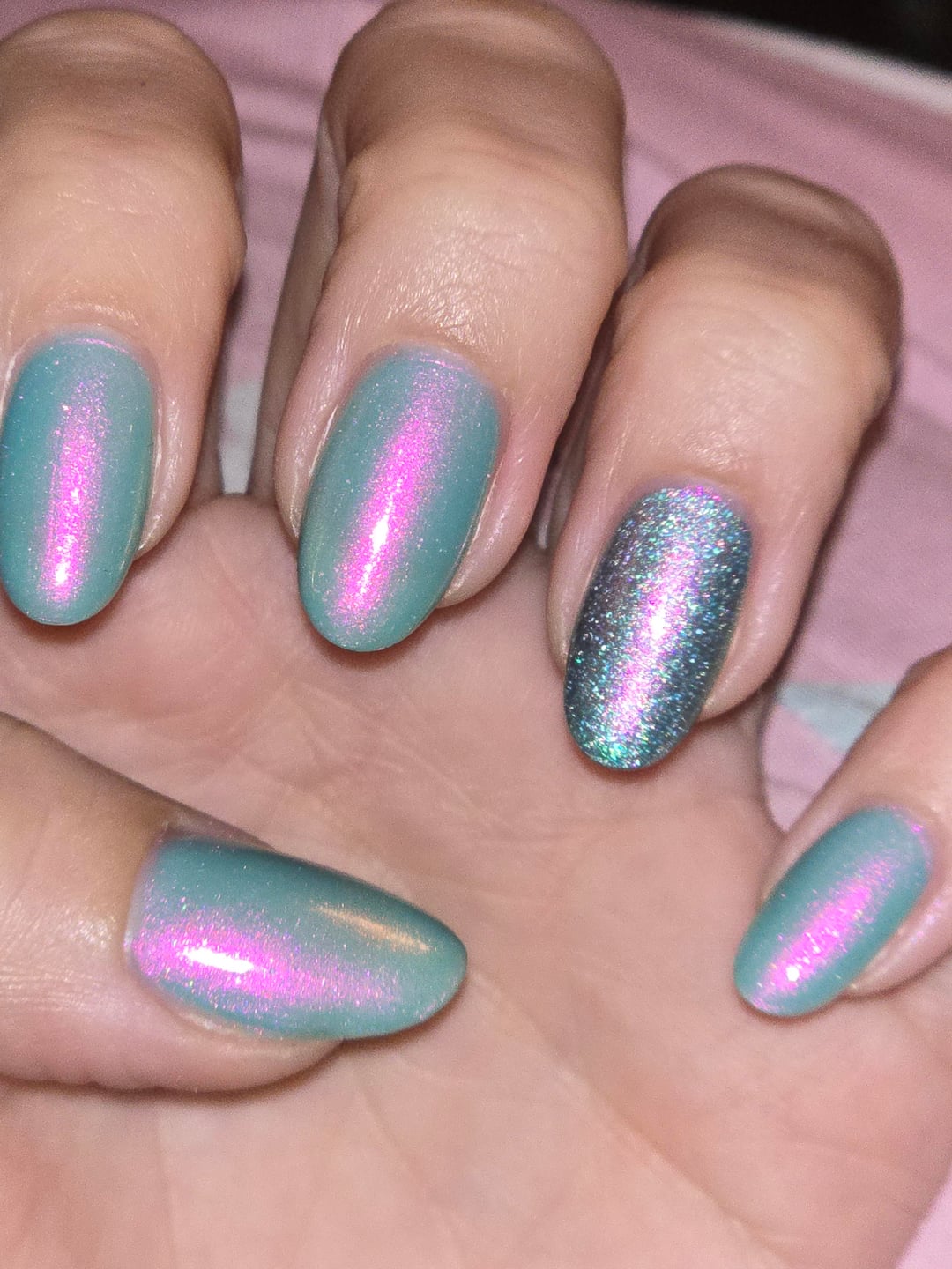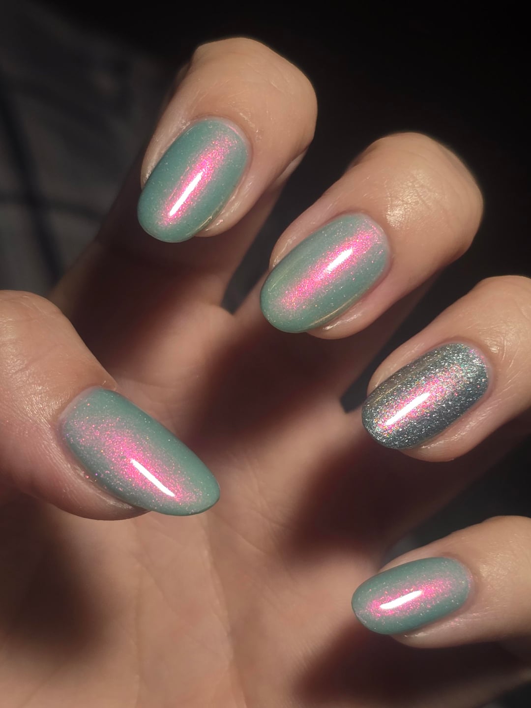 Colors: 3x Nettle and Briar by Lurid Lacquer and 2x Enchanted Aura by LynB Designs on the ring finger
