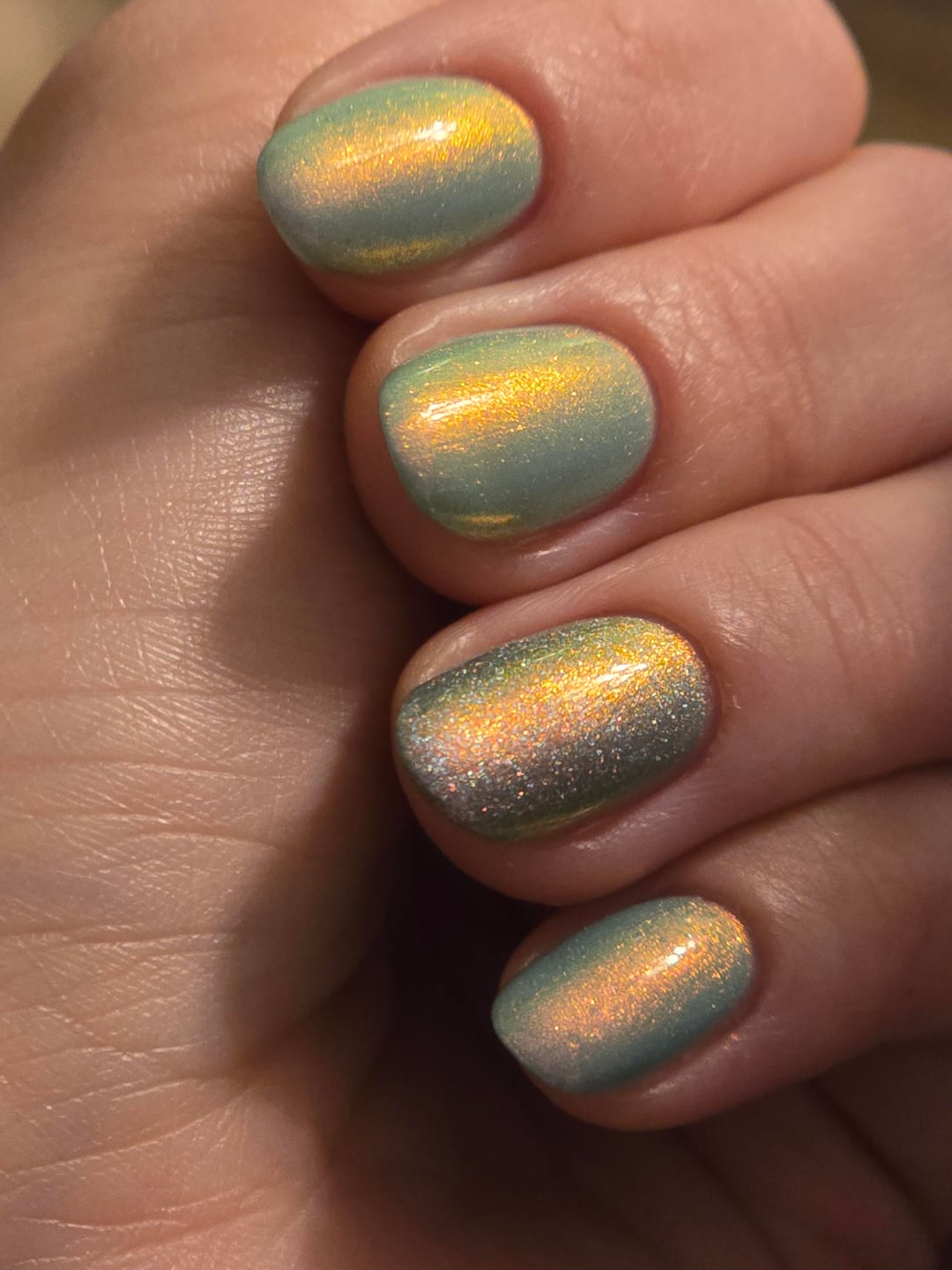 Lighting: Pic 1 – under my desk lamp, Pic 2 – phone camera flash, Pics 3 and 4 – under the overhead lighting in my living room to show off the shift.