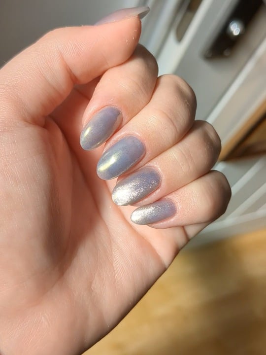 Blue jelly base + chrome powder + golden cat eye gel