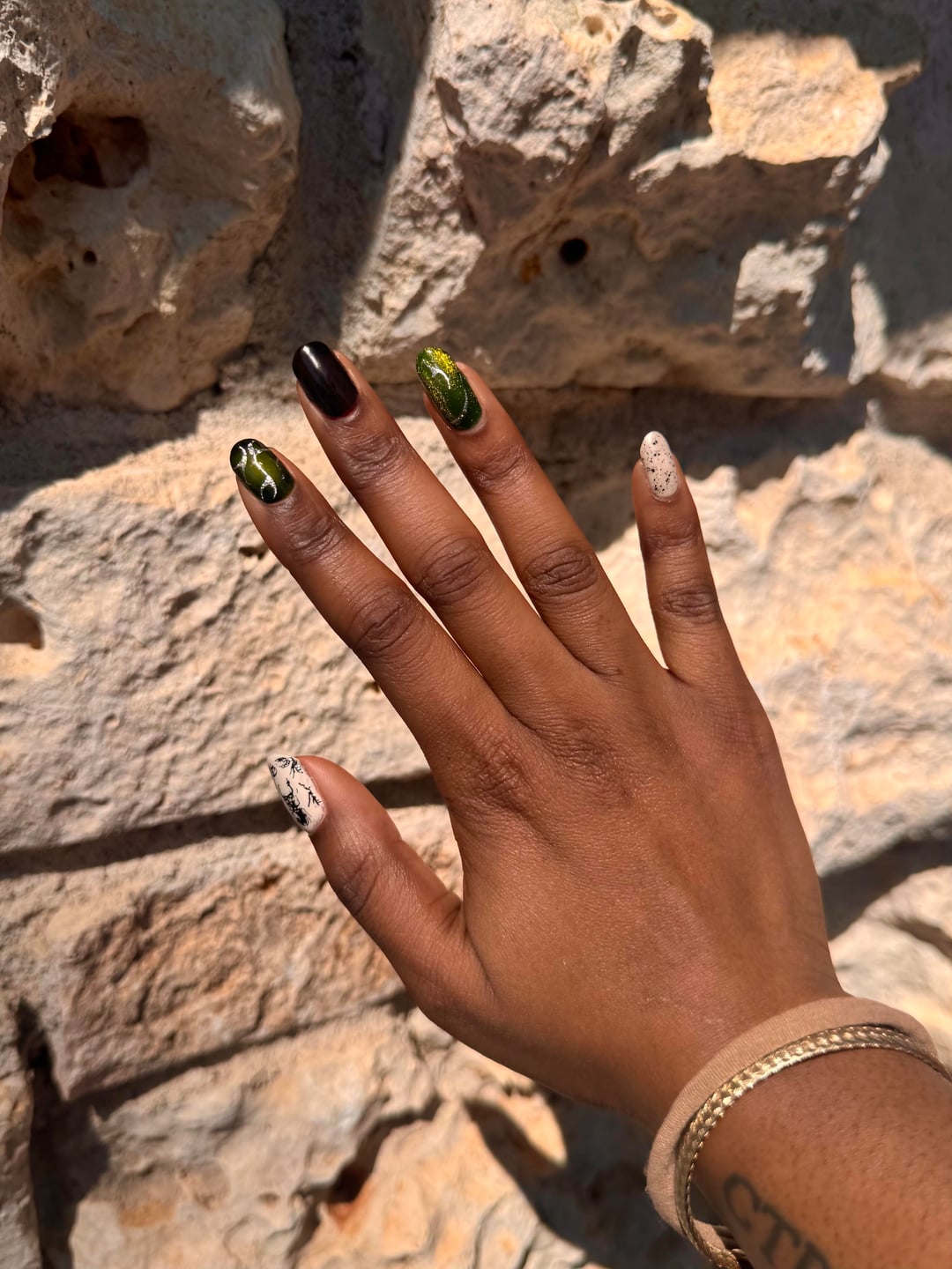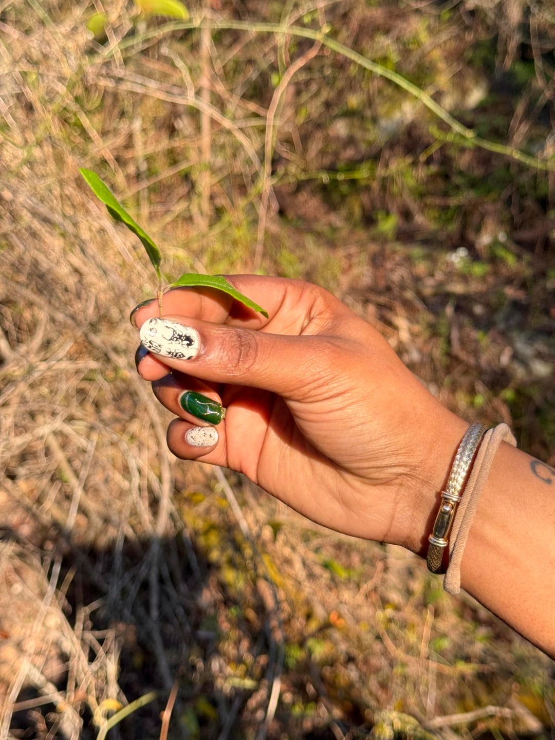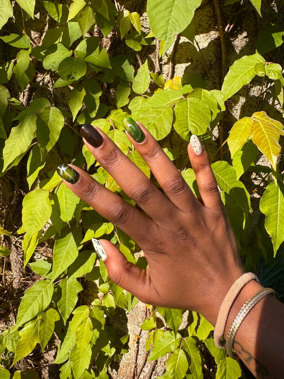 i went on a short trip to a state park and decided to do a cute nature themed skittle for the occasion!! also green for late st. pattys day haha💕😛 this was definitely a mani of firsts for me! first time doing aura effect, first time using any nail powder, and first time nail stamping 🙂