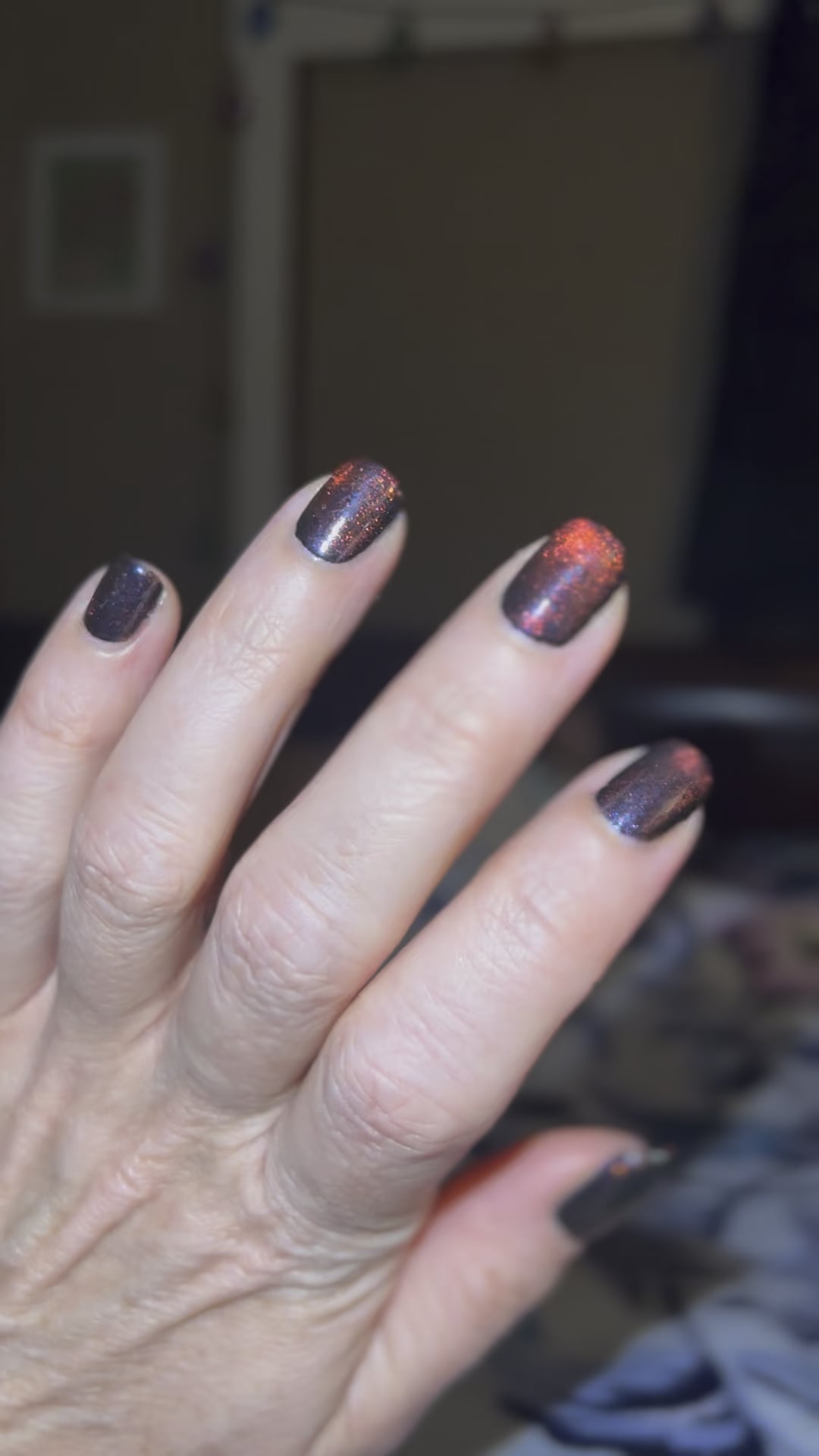 1 coat Nailtiques 2, 2 coats MC 13th Hour, 1 coat Scorchy (magnetized glass bead with 5D spinner), 1 coat Sally Hansen QDTC