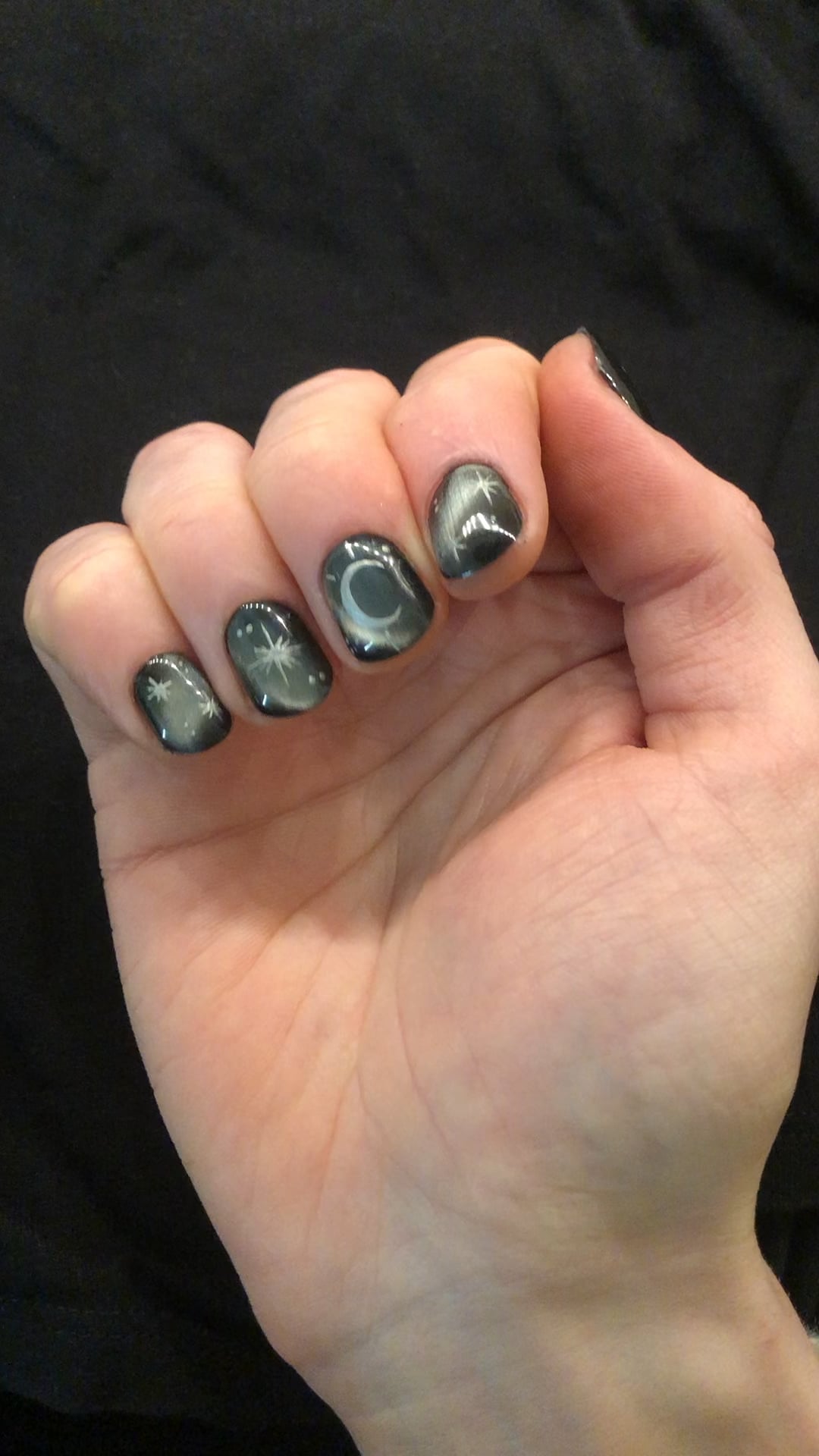 My nail tech has outdone herself this time. I just can’t stop looking at them. Black (2 layers) > translucent cat eye with a slight blue tint > silver metallic detailing. by quantum_unicorn