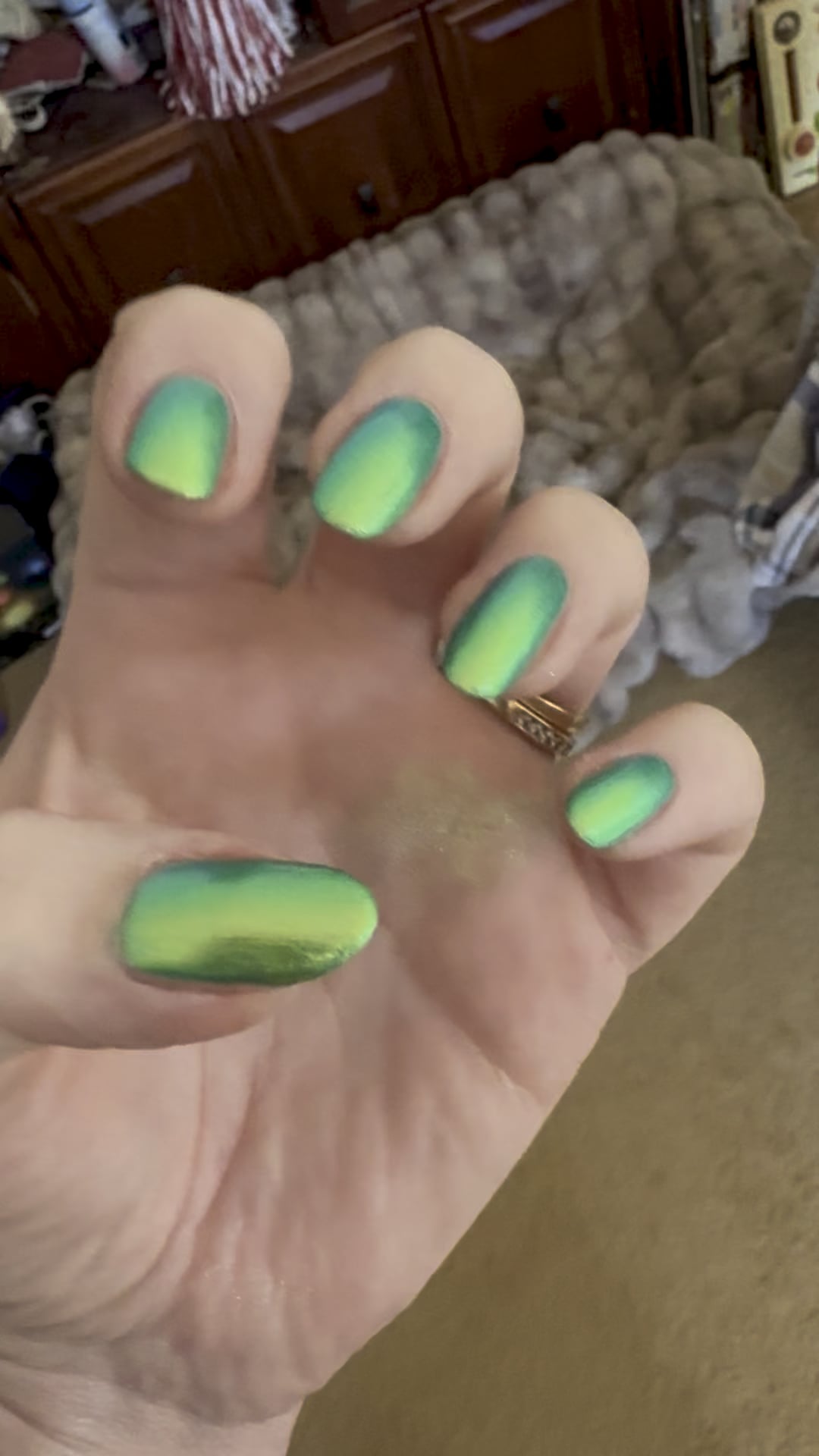I’m currently in mid mani atm but I couldn’t wait. I just had to show y’all! (I haven’t even made it to top coat yet🤙🏼) But Holy shit!! 🥹🤭ohh me o’ my…🤗This polish is truly something special!💚💛💙