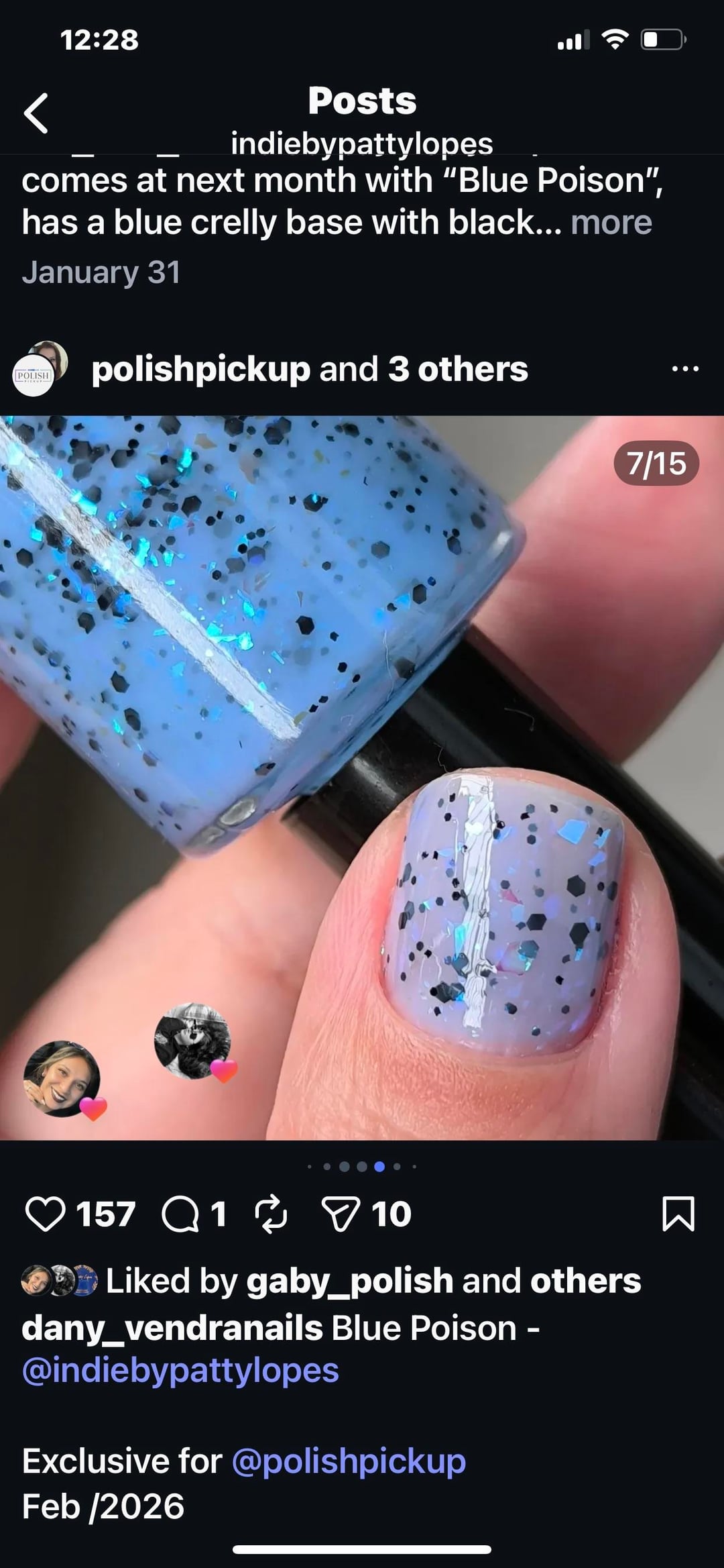 Blue Poison by Patty Lopes PPU 2/26 is gorgeous. I’m seeing a lot of hate towards the maker and people saying the color doesn’t match the photos but mine looks exactly like the swatch photos. I only did 2 coats cause I love how magical it looks but did a third coat on my left thumb to see if I could match the swatch photos and it’s a match. My right thumb is with 2 coats. Left thumb with 3 coats.