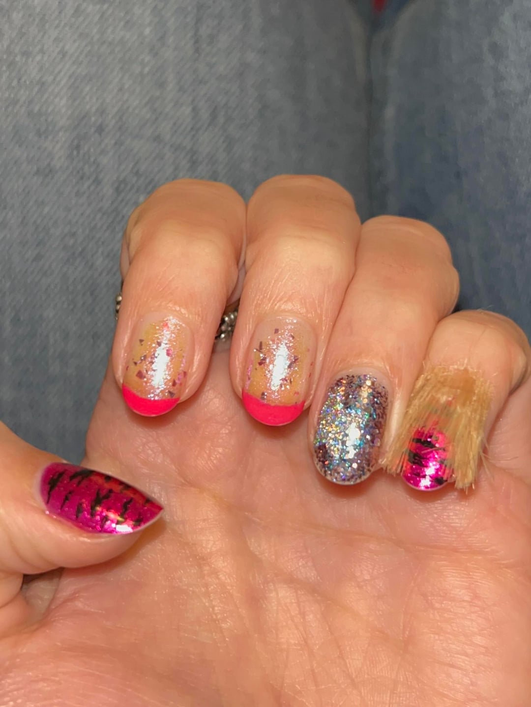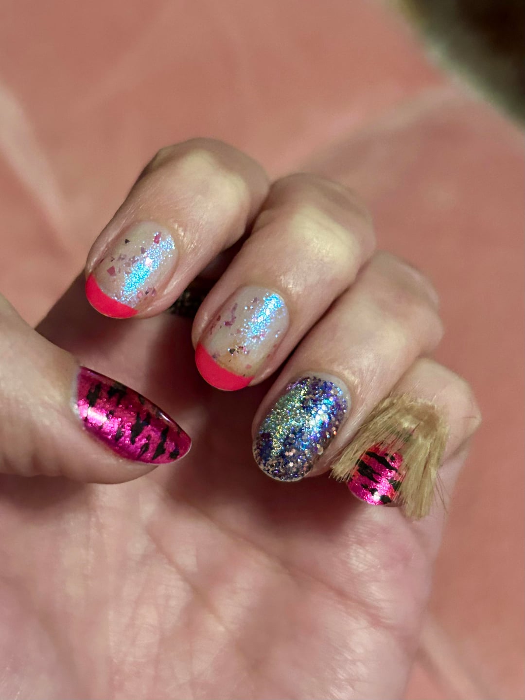 Had to do a manicure for the Hannah Montana special! Inspired by some of my favorite outfits in the series. I’m so happy the nail wig lasted for the whole watch party 😂 the glittery base for the French is turning super yellow on me, any tips to cancel it out next time?