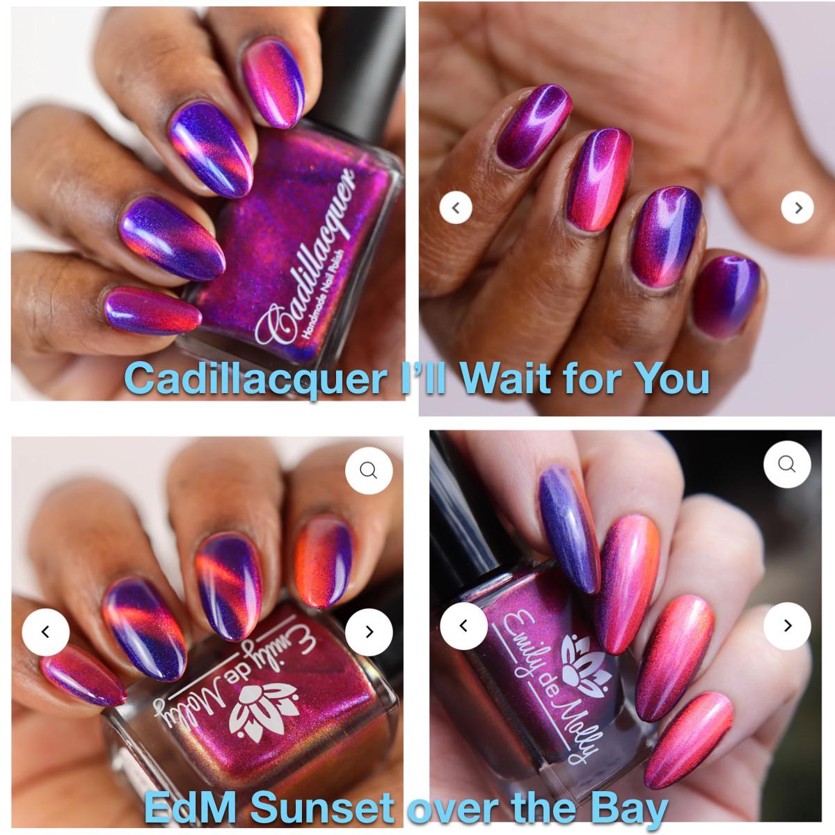 Does anyone have both Cadillacquer’s I’ll Wait for You and Emily de Molly’s Sunset Over the Bay and be willing to share IRL swatches? Trying to decide which I want because they seem so close to each other in pictures.